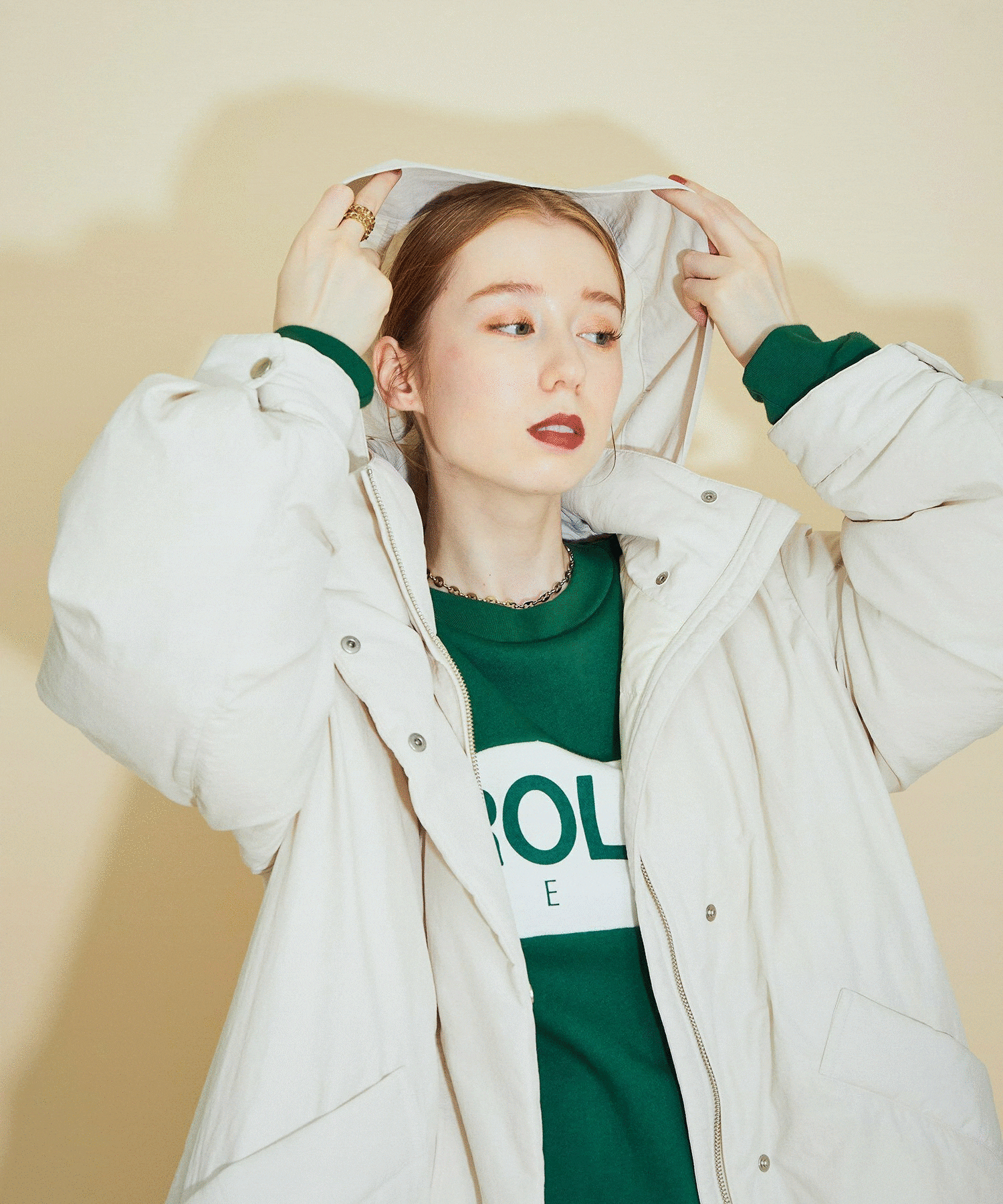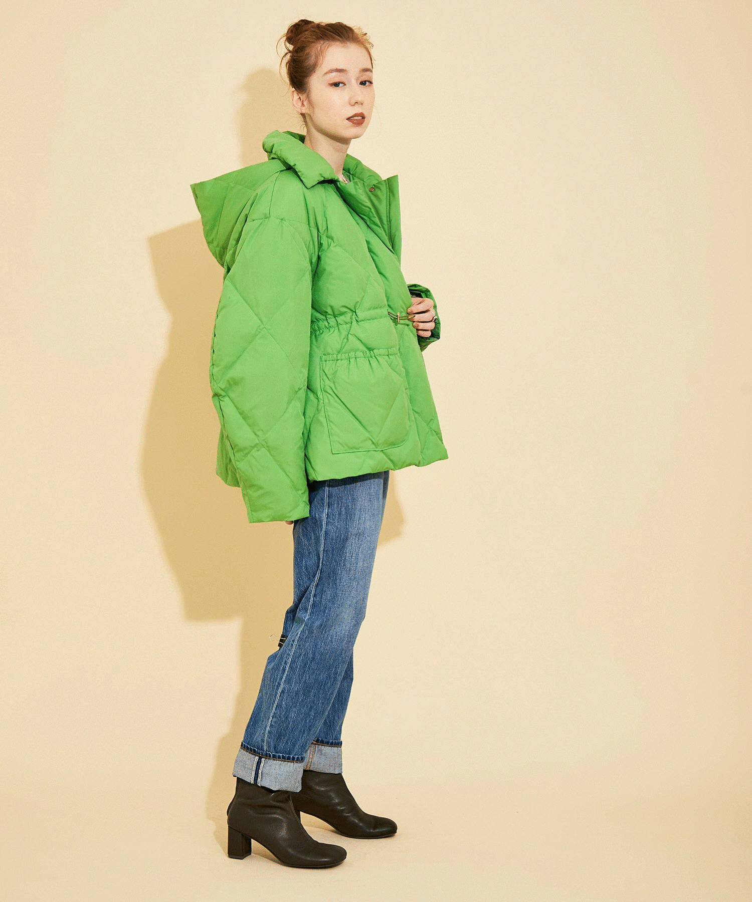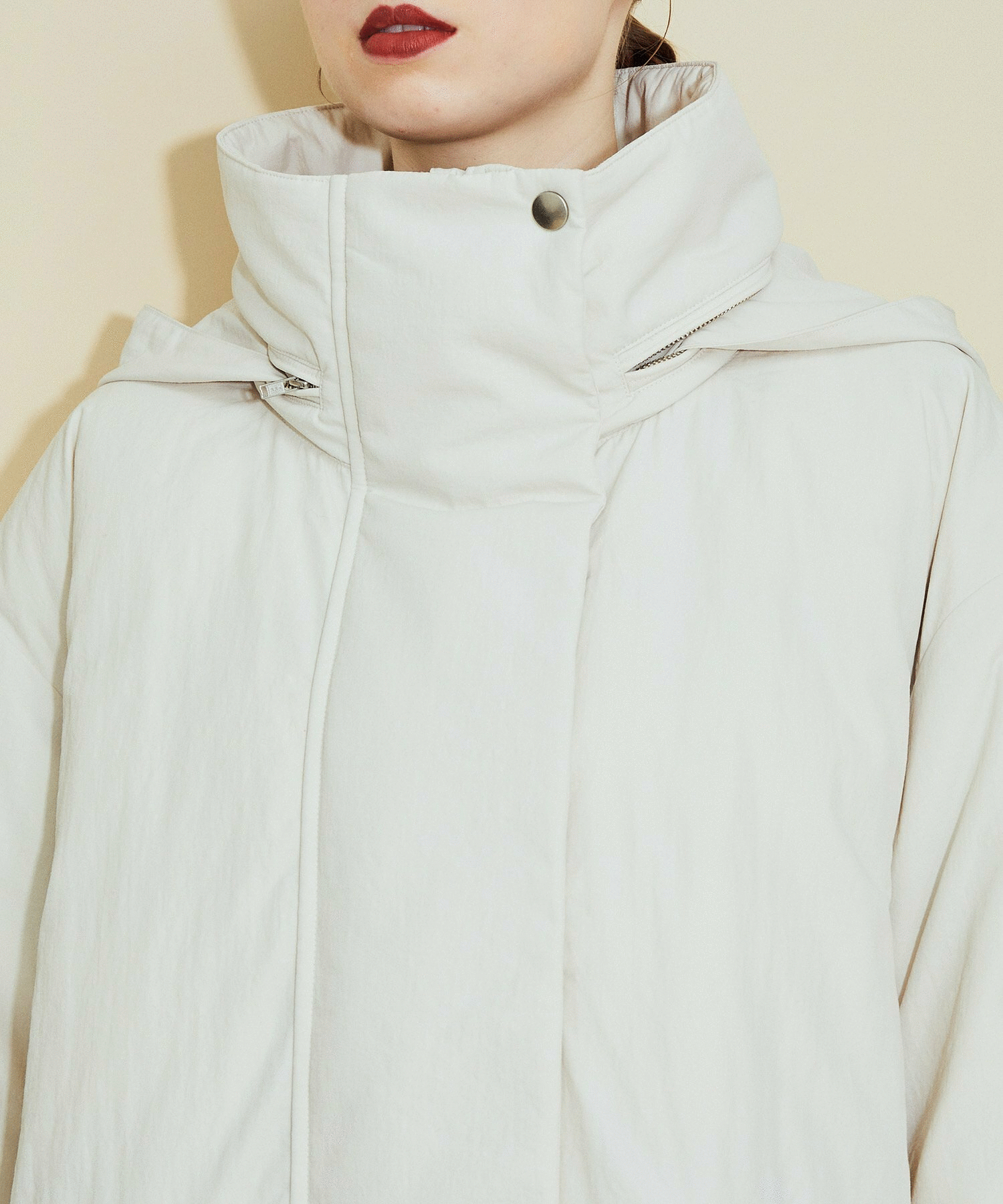 取り外し可能な大き目のフードは小顔効果を与えてくれます。