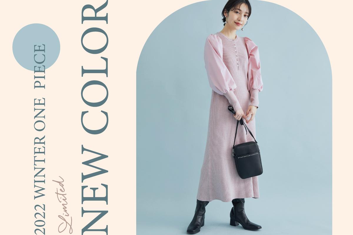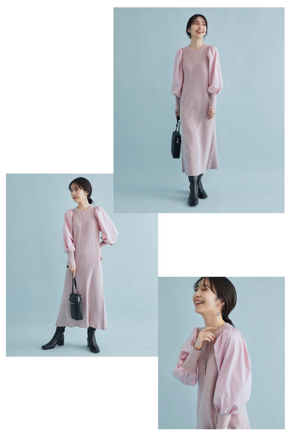 人気のボリュームスリーブ釦アクセントAラインニットワンピースからジャドール・店舗限定で新色ピンクが登場!