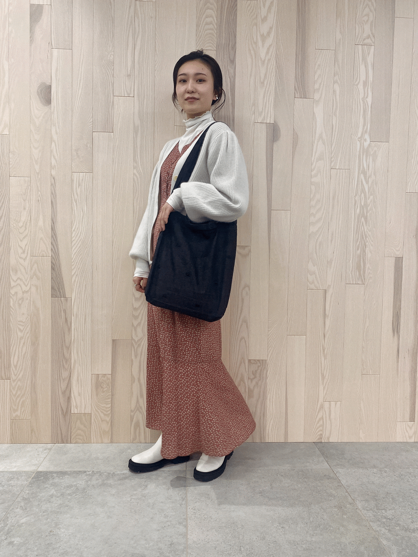 合わせやすいカーディガンには花柄のワンピースをプラスして。