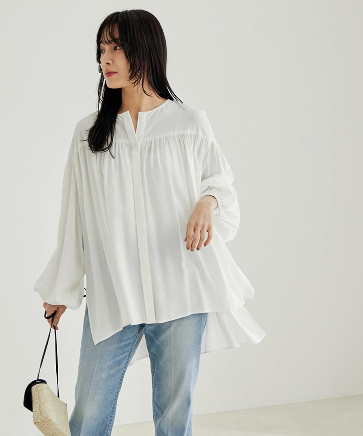 バルーンスリーブとニュアンスのあるギャザーが女性らしいチュニックブラウス。