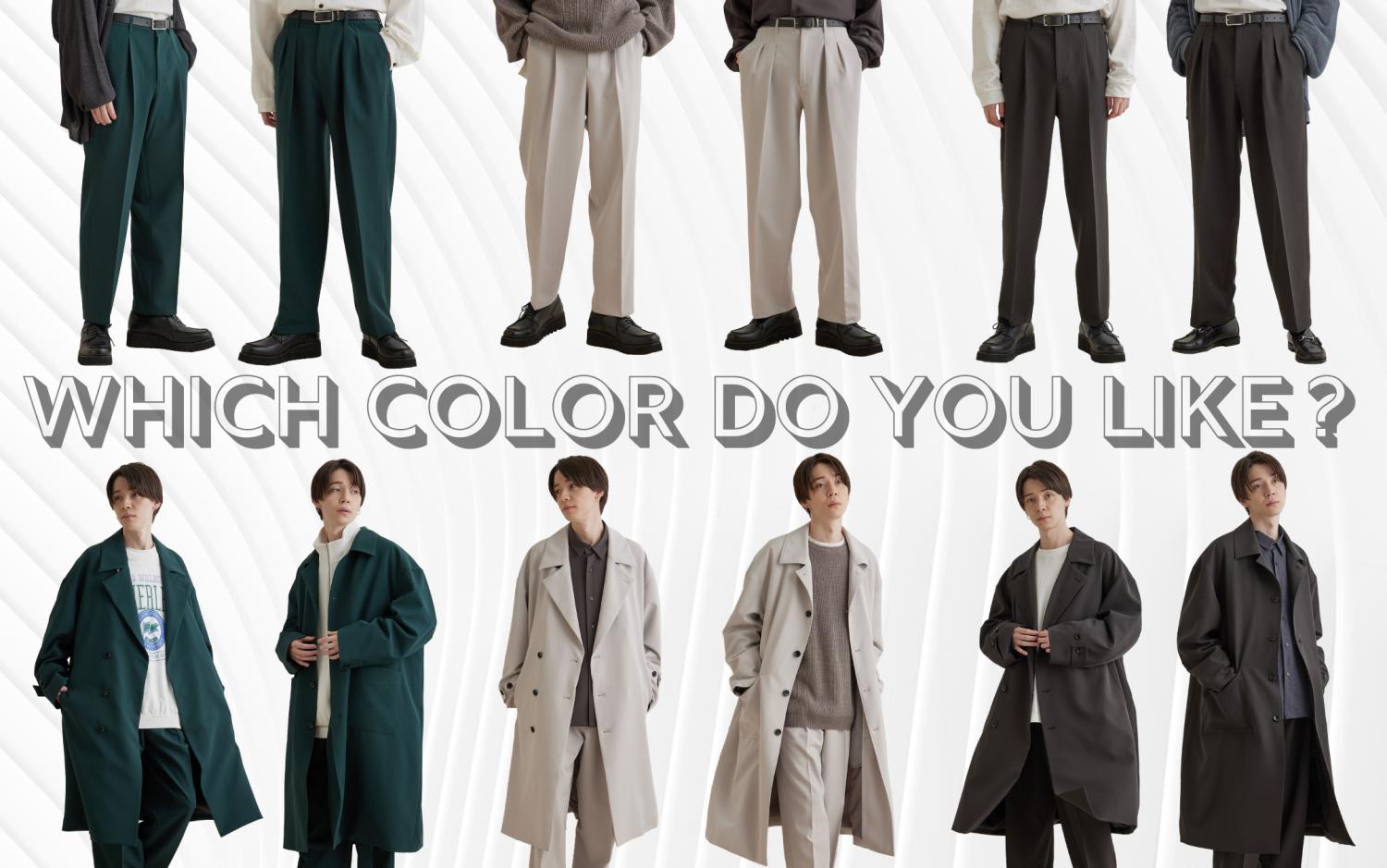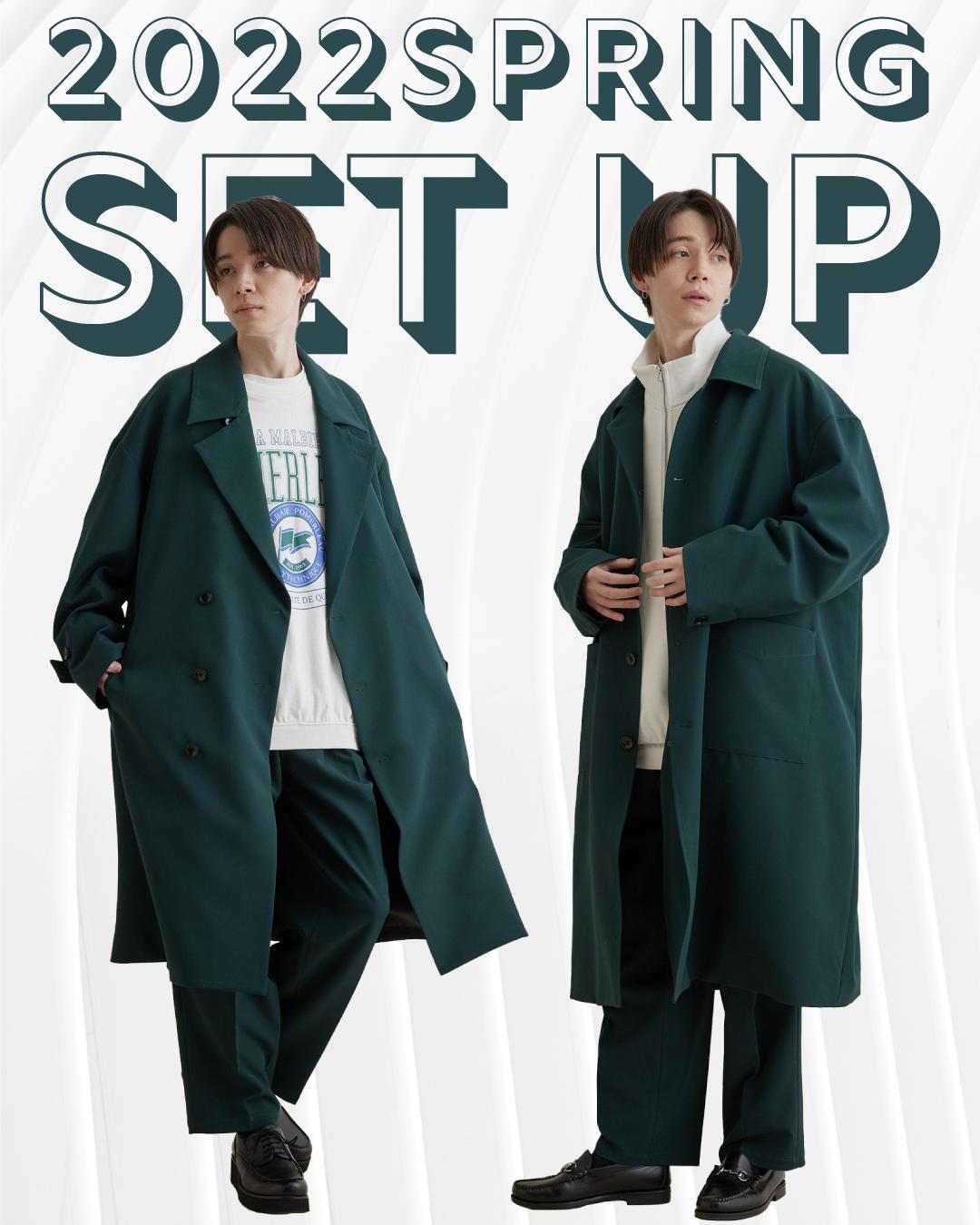 微光沢で高見えする、トレンチコート、バルカラーコート、ストレートパンツ、ワイドパンツのバリエーションで組み合わせが楽しめるセットアップシリーズを是非チェック。