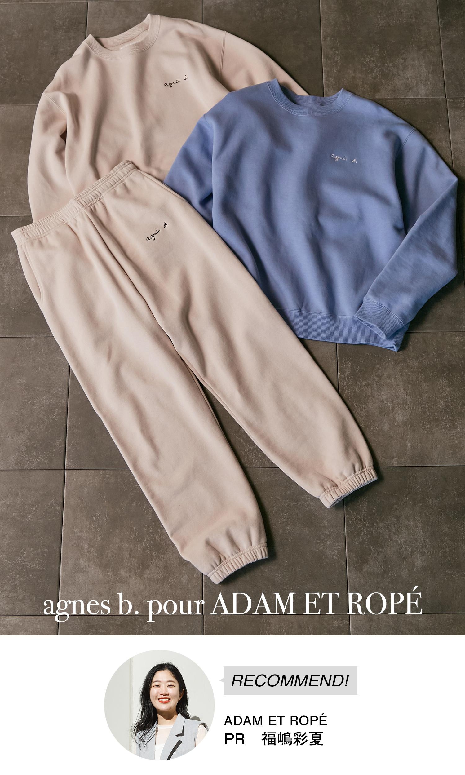 「毎シーズン大好評の『agnes b.』別注アイテムですが、今年は今までになかったライトグレー、ベージュ、ライトブルーの新色が登場しています。小さく入った『agnes b.』の刺繍が何とも言えない可愛さです。カジュアルなスウェットでありながら、モード感が演出できるところが、個人的にも気に入っています。さらに、今年はスウェットパンツが新登場。ラフになりすぎないすっきりとしたシルエットがポイントで、セットアップでの着こなしに最適です。また、トップスは、スラックスのようなメンズライクなボトムと合わせてかっこいいスタイリングをするのも◎。パンツは、あえて女っぽいシャツやヒールを合わせたミックスコーデを楽しんでみたいです!」"
