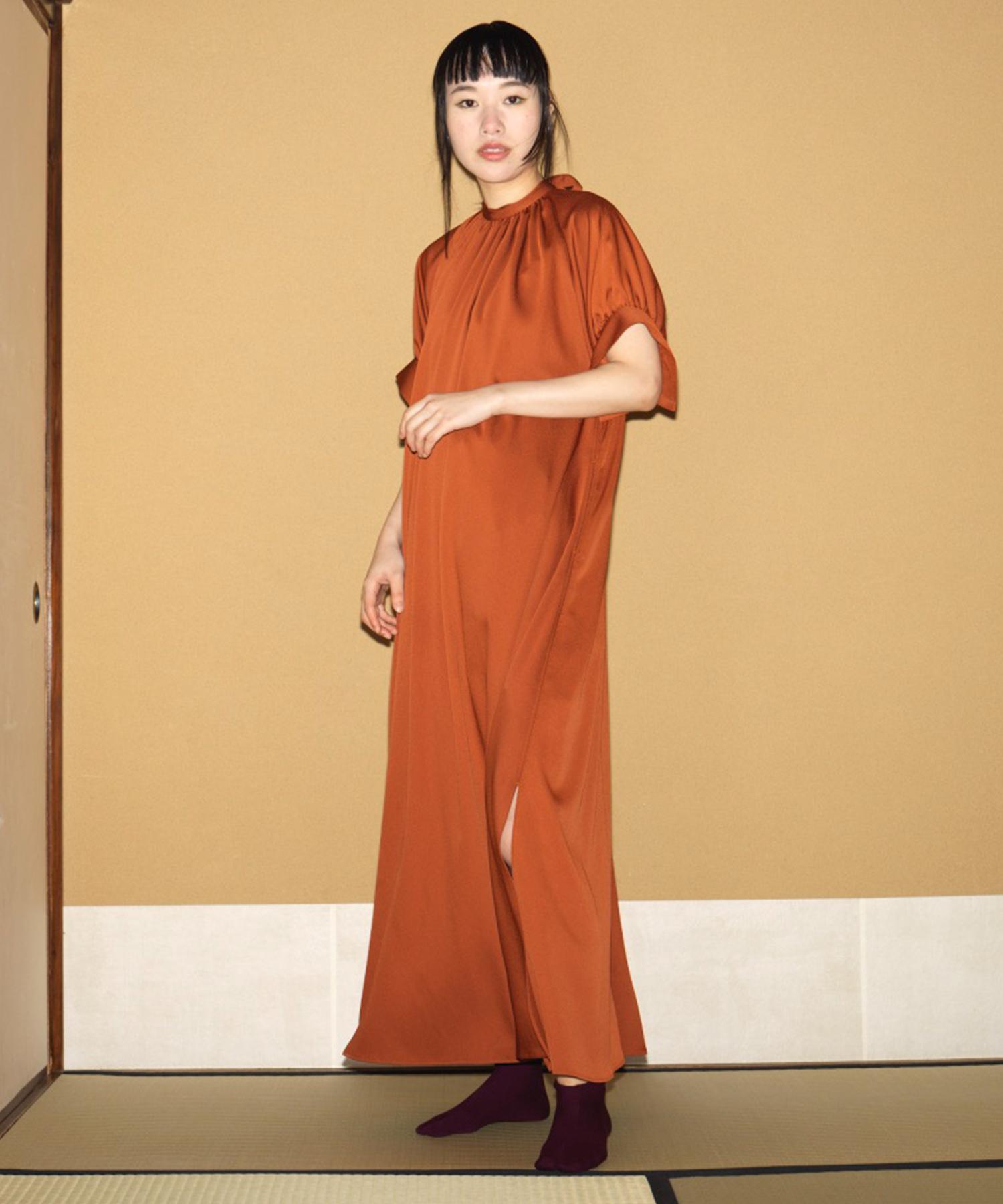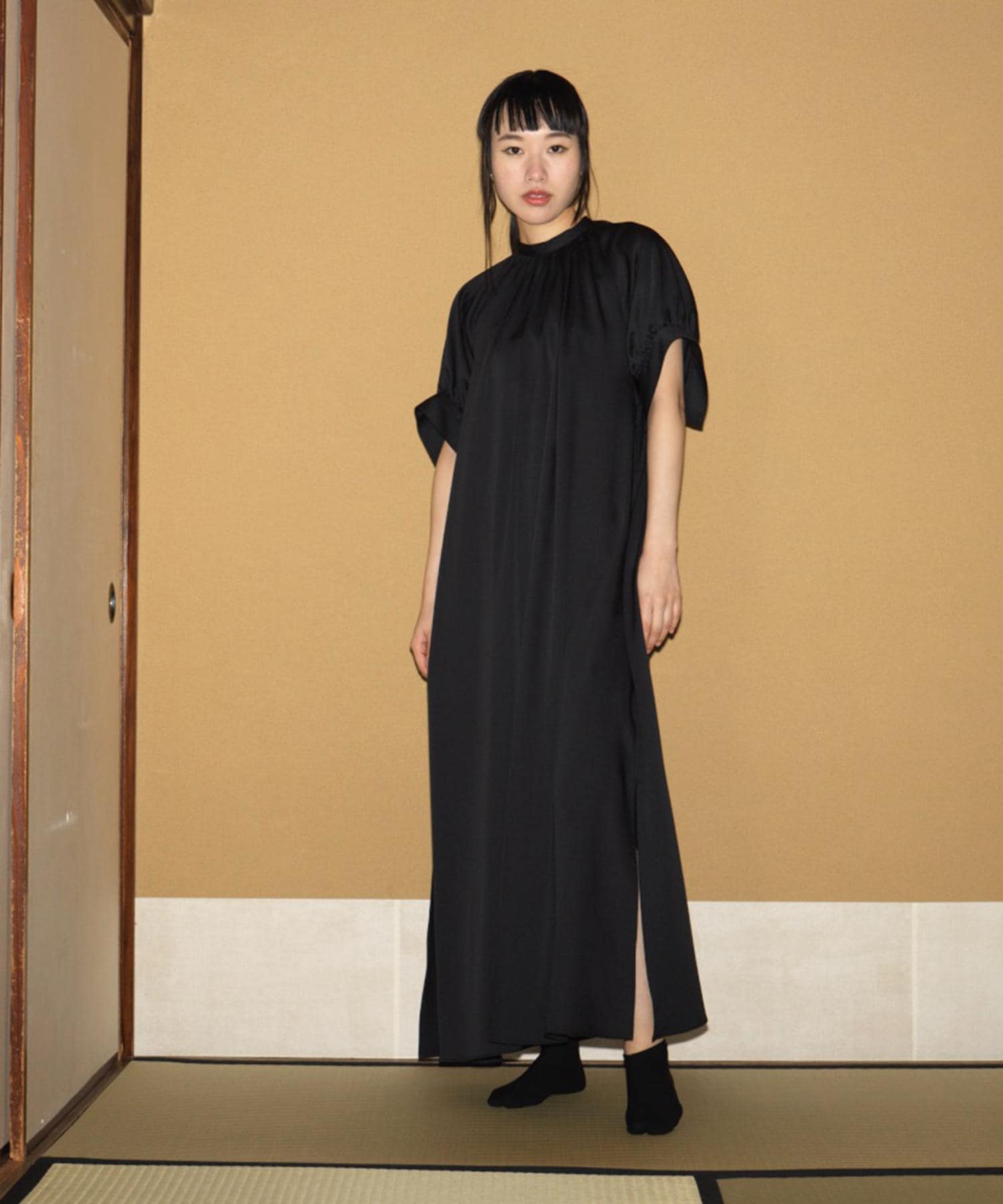 「狩衣」からインスパイアされたこのドレスは、割烹着のようにすっぽりと身体を包み込み、