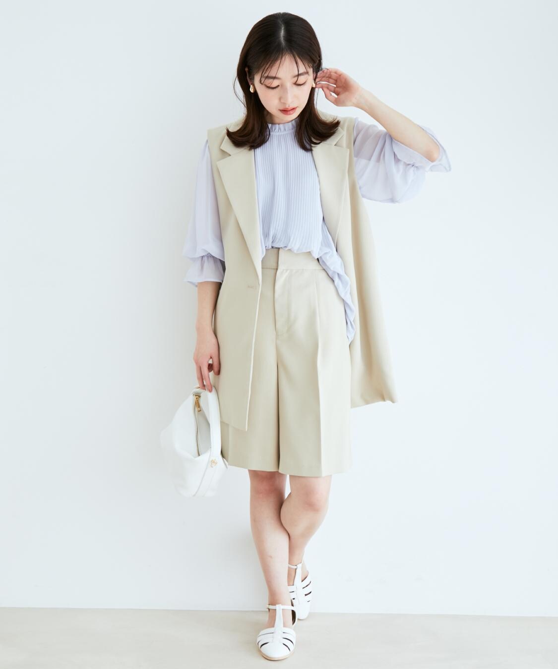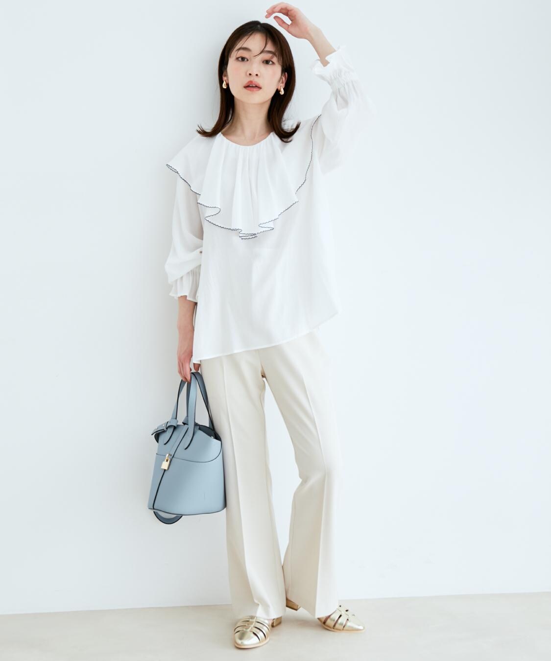 ブラウスのシフォン素材と襟元のフリル、プリーツでキレイめな印象に。
