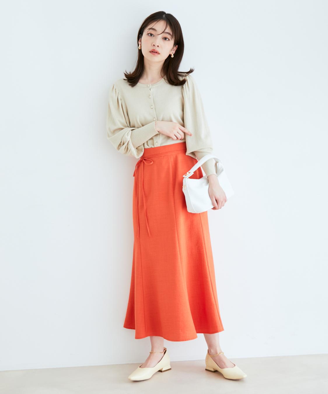 フロントの多釦デザインやウエストの共布リボンなど細やかな部分が今っぽく仕上がるポイント。 発色の良いオレンジがコーデのアクセントに。