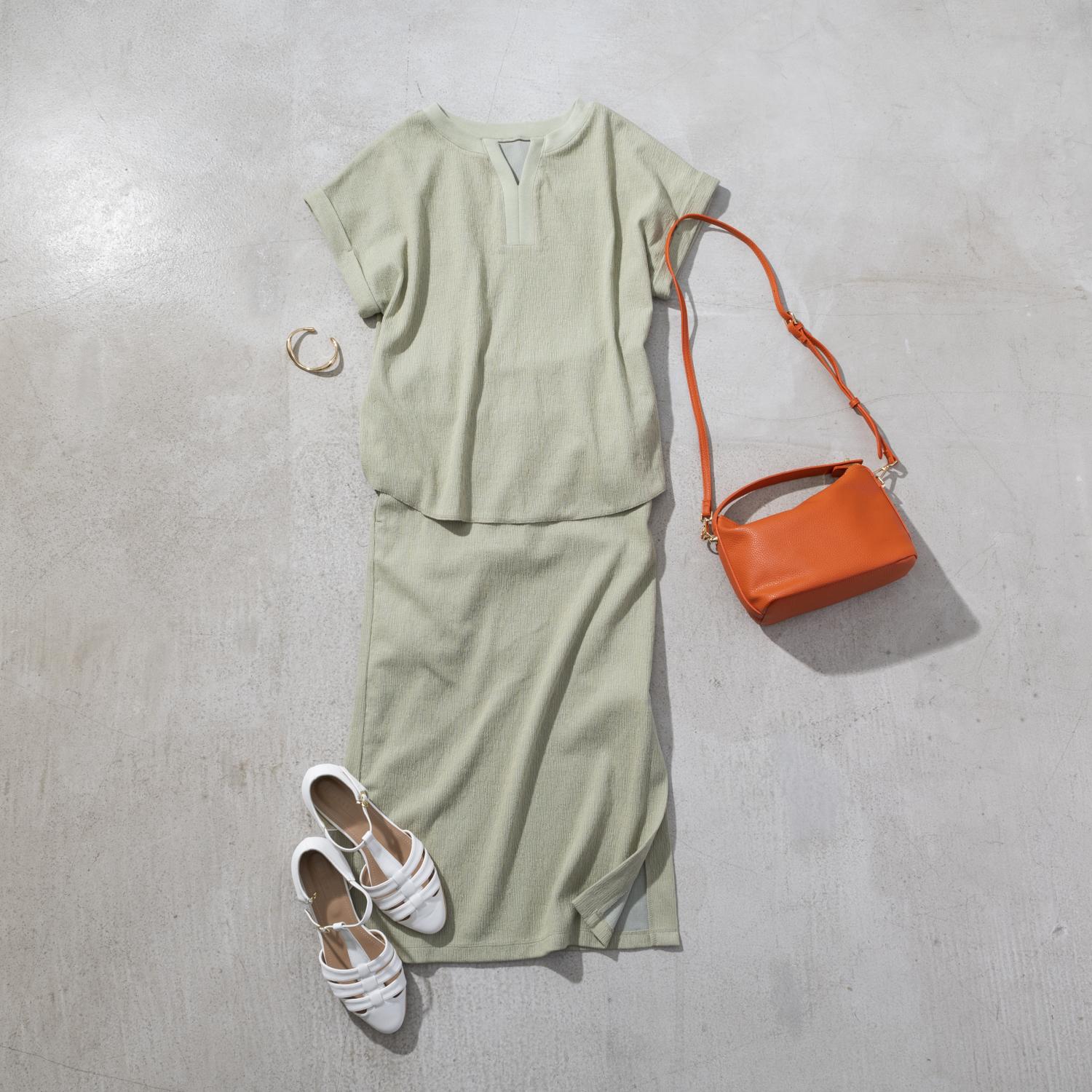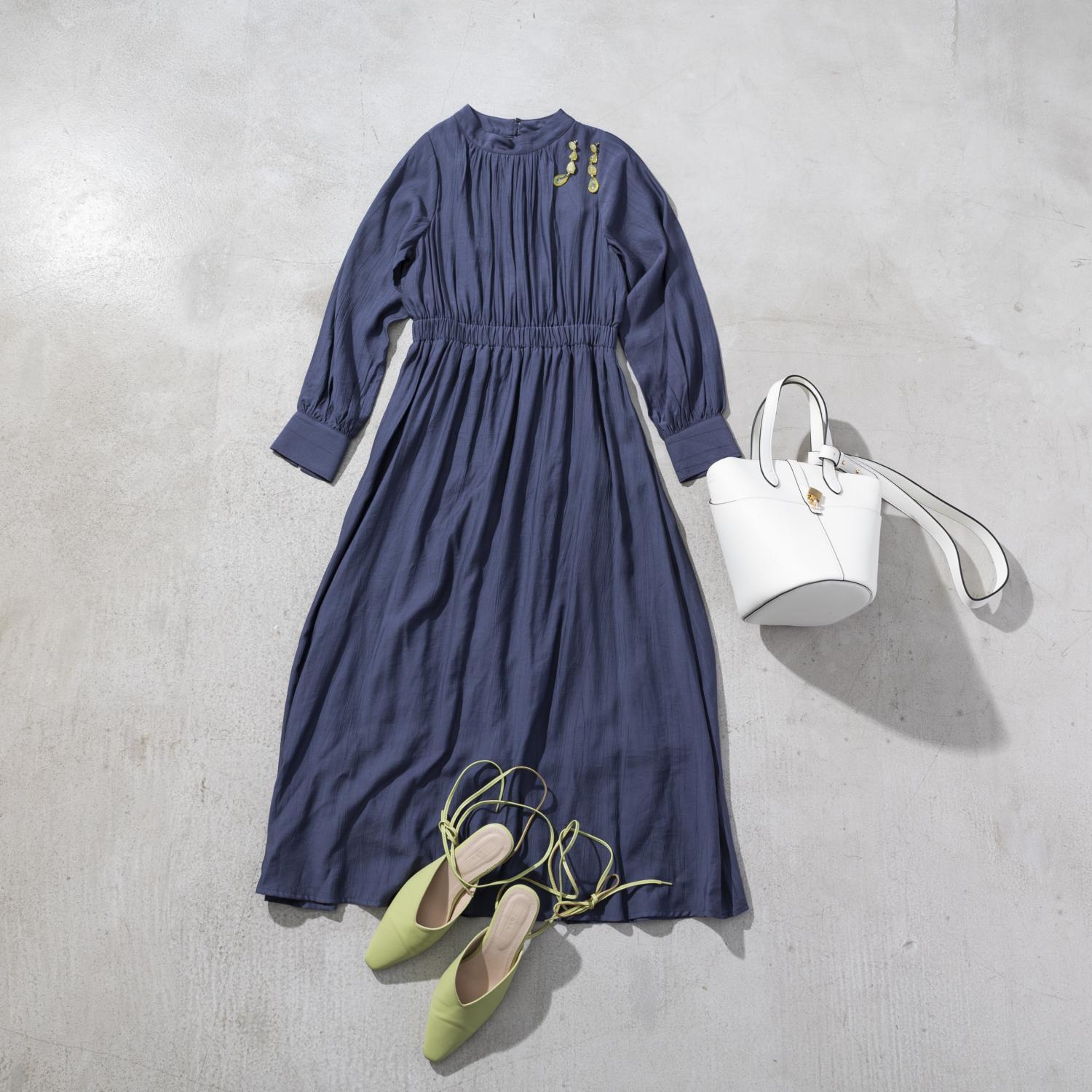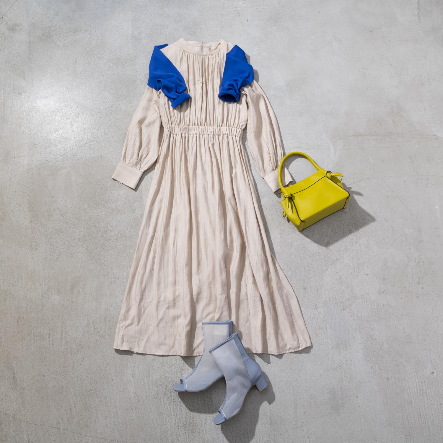 ナチュラルなベージュワンピースに最旬カラーで取り入れて春らしく!