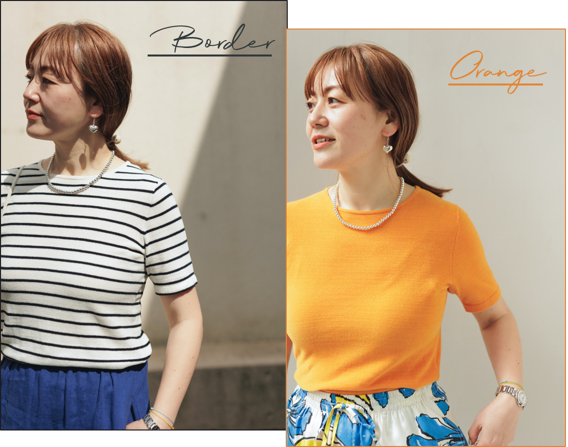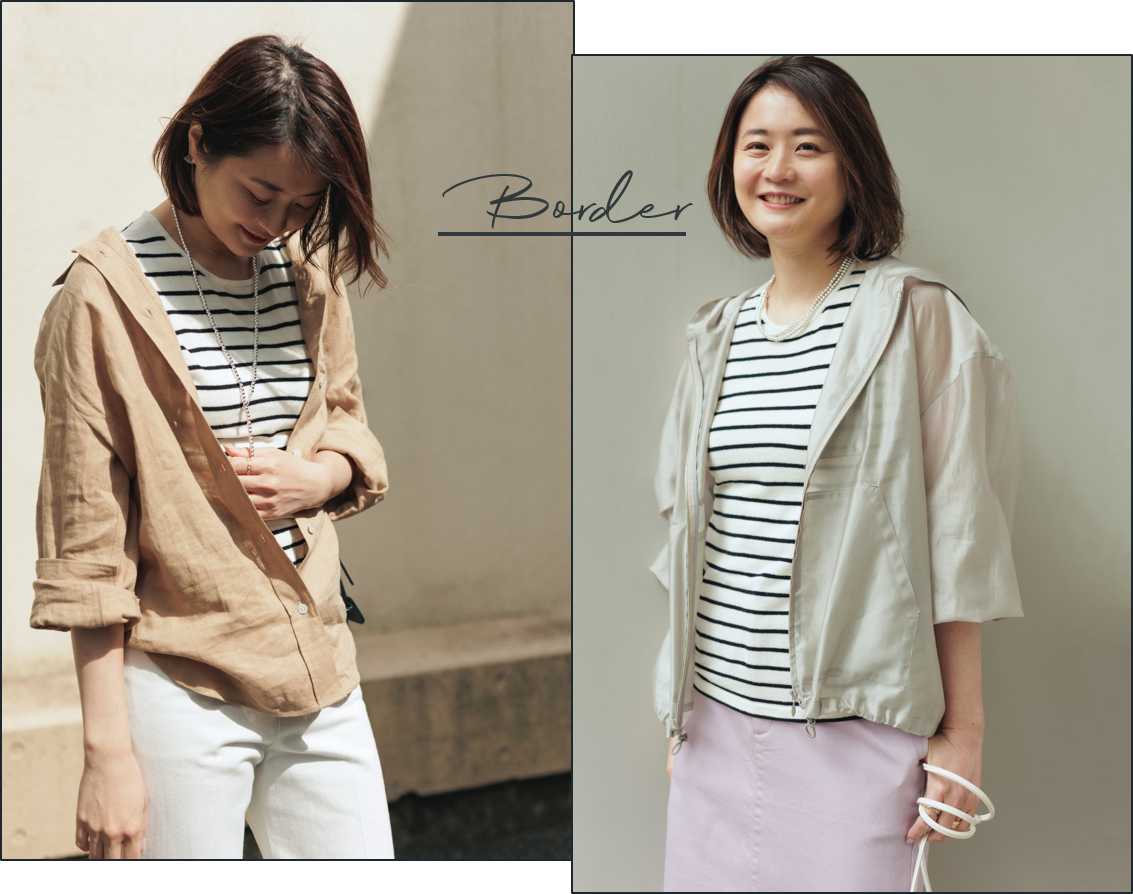 ビーチへのお出かけを想定したスタイリングは、ボーダーにリネンスカートのブルーを。風になびくと美しい線を描くエレガントなフレアスカートに、ボーダーのカジュアルさをプラスしてみました。
