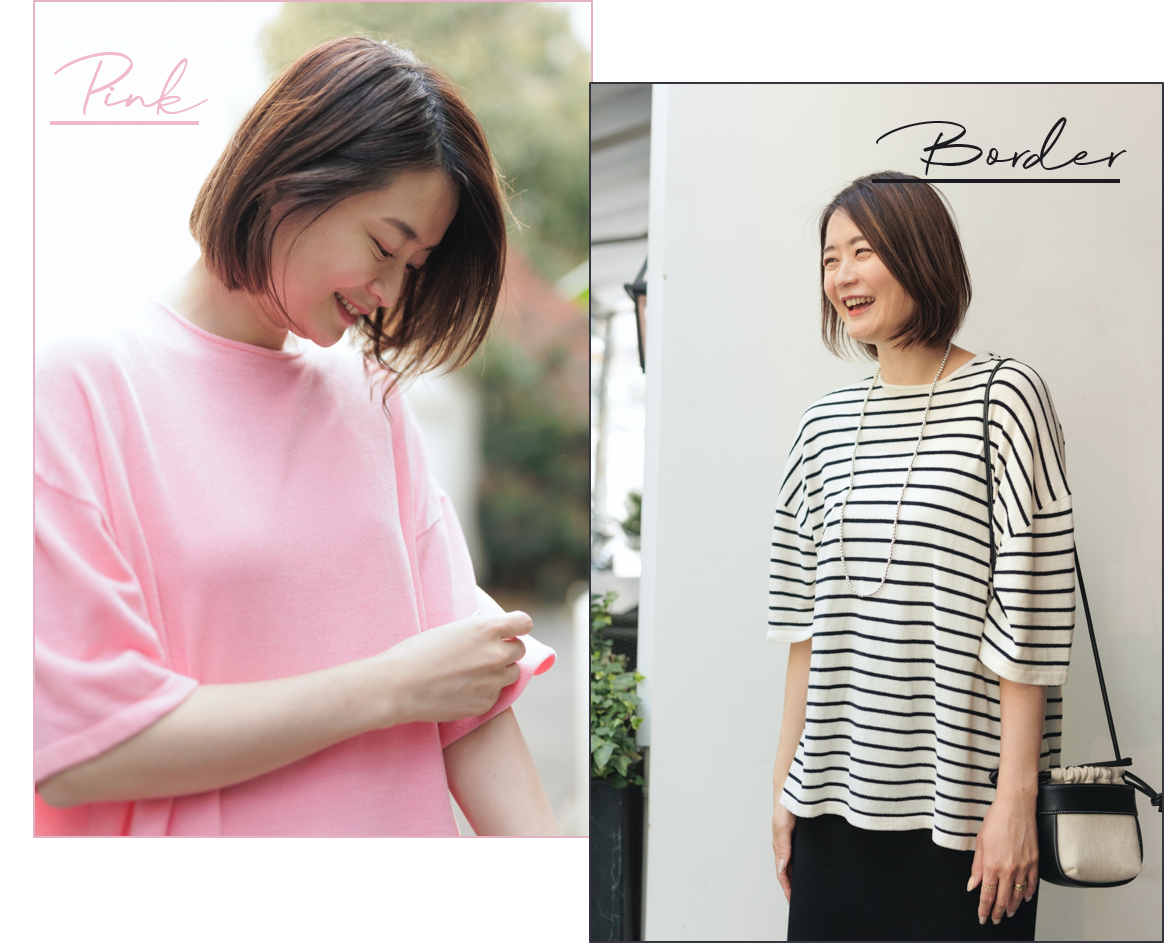BIG T-Shirtは5分袖×リラックスシルエットなのに、気になるボディラインを隠して、スタイルアップに