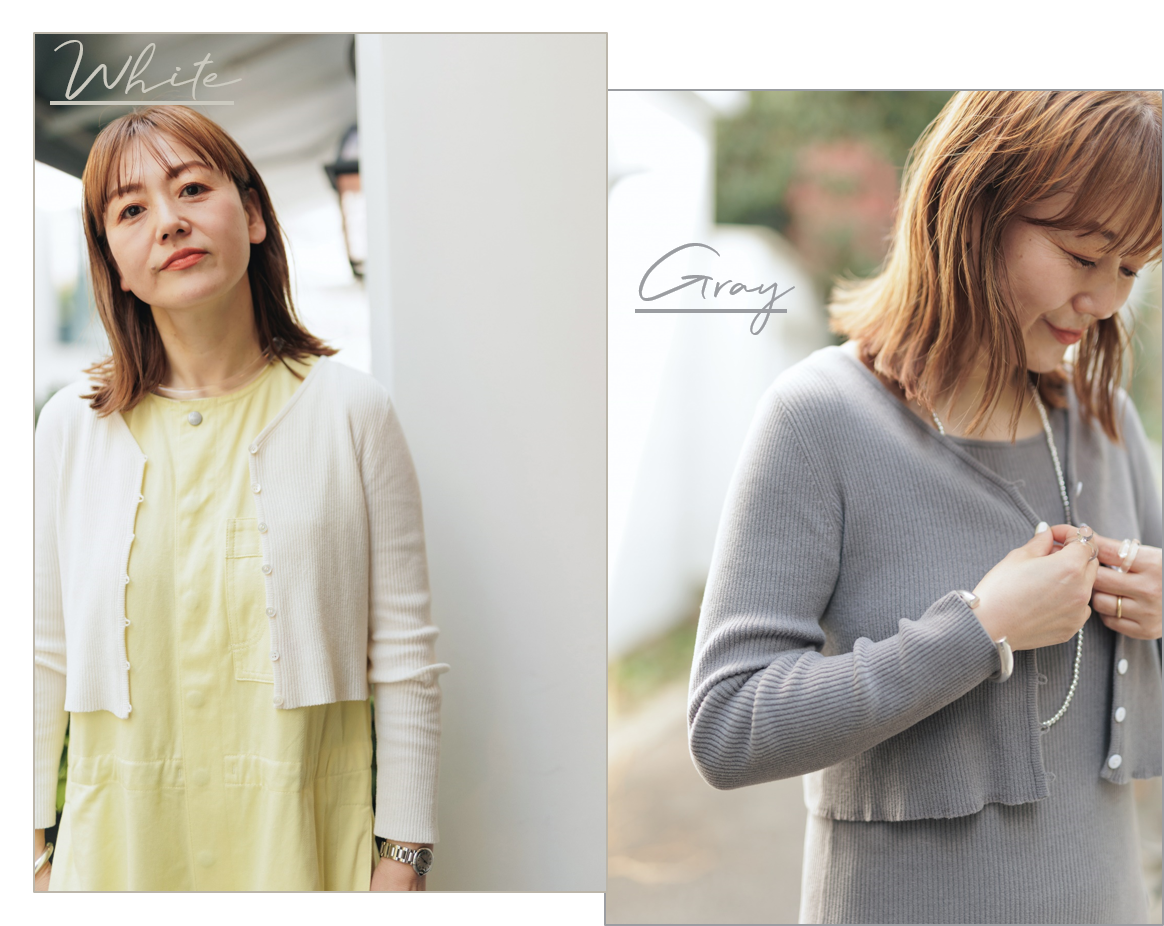 今の季節は朝晩はまだ冷えるので、同シリーズのカーディガンも組み合わせて着用しています。