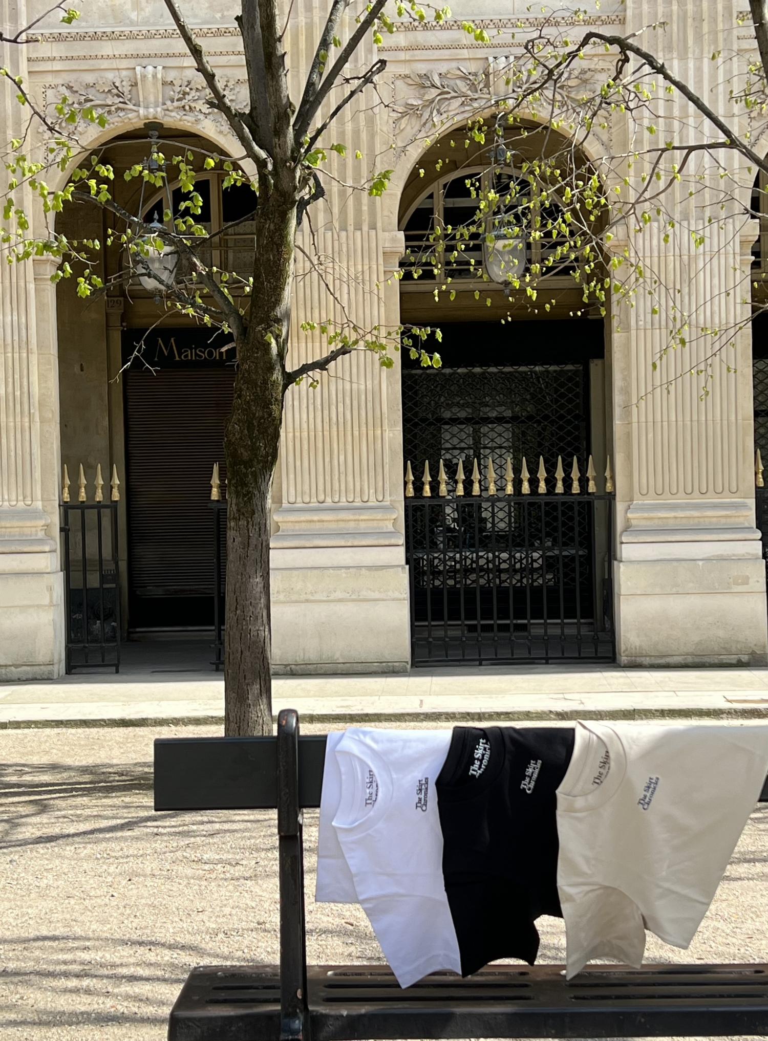 シンプルカラーのキャンバスに絶妙なバランスで配置された「The Skirt Chronicles」の刺繍ロゴがポイントの別注Tシャツ。ホワイト、ブラック、ベージュの3色展開で、ベージュは涼しげなブルーのロゴで洗練された印象に仕上げました。