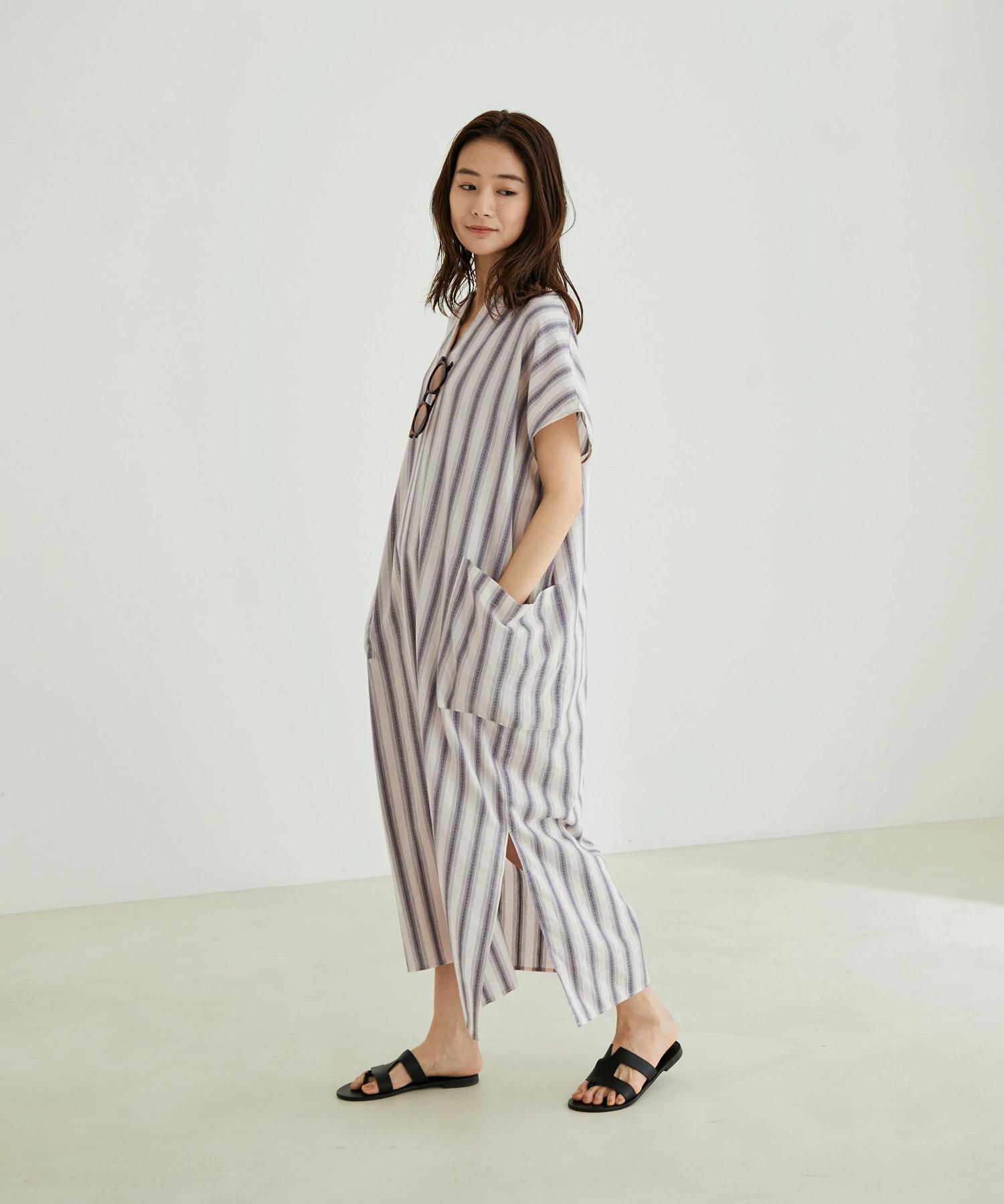 【WEB限定】マルチストライプキーネックカフタンワンピース