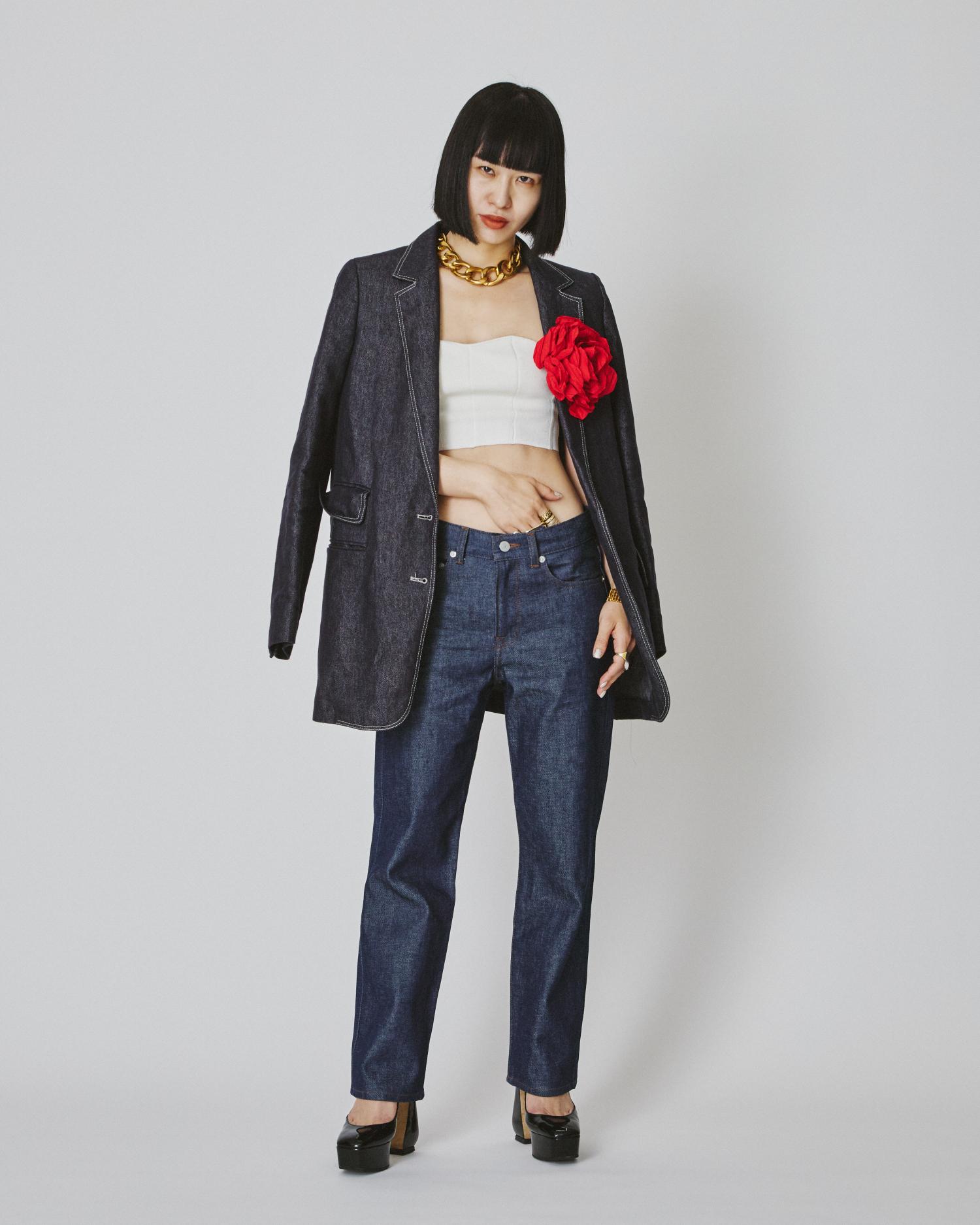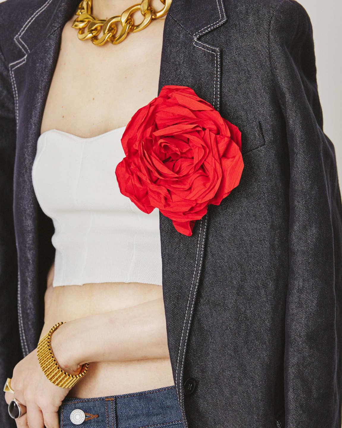 色の濃いデニムにテーラードジャケットを合わせるとトラッドなムードになって、デニムをカジュアルではないバランスで着こなせるのが気に入ってます。春夏シーズンからコサージュが気になっているので大きな赤いお花を取り入れてみました。デニムに赤を入れると品が出るから好き!