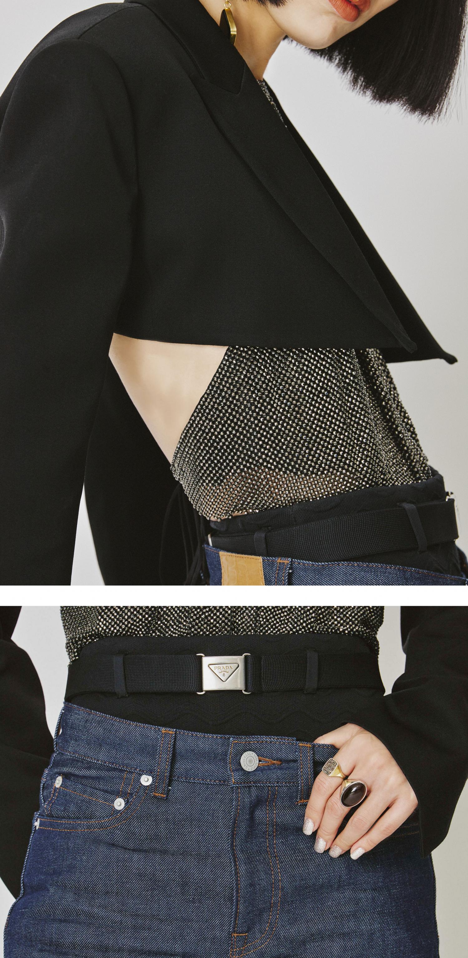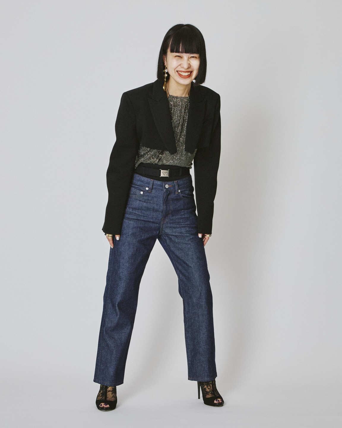大胆に肌見せする時はバランスが重要!トラッドなジャケットスタイルとは逆にあえてショートジャケットを。デニムをドレッシーに着たかったので、キラキラのパーティー感のあるトップスを選びました。