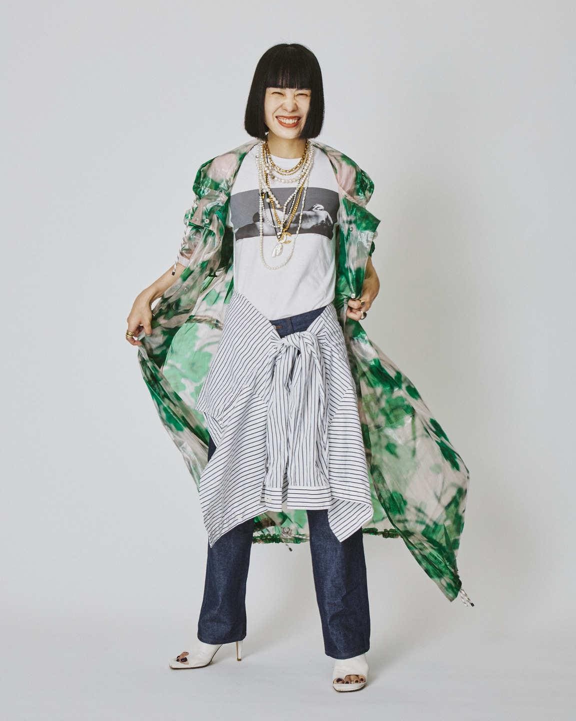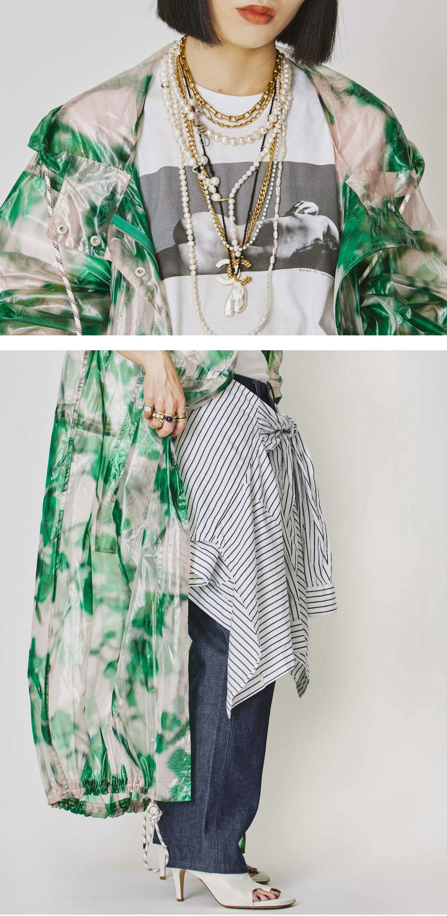 スポーティーなアイテムと組み合わせる時はヒールを入れて女性らしさをプラスするのが定番です。Tシャツにはアクセサリーを重ね付けすることが多いですが、ただ付けるのではなく分量感やデザインのバランスが大事で、毎回鏡を見ながら付けたり外したりしています。カジュアルな時はパールを合わせるのが最近のブーム!