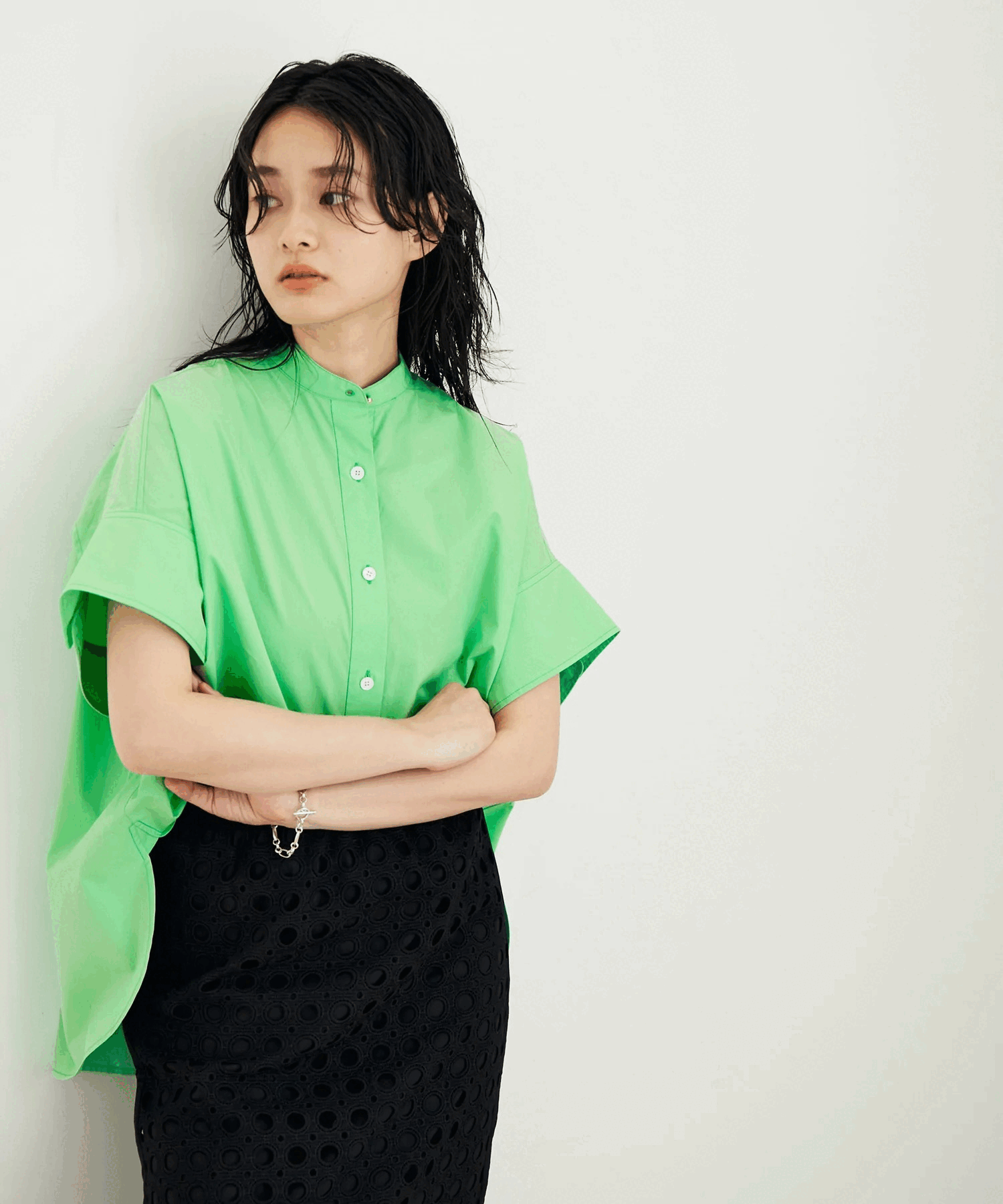 ギボシボタンがワンポイントになっており、インでもアウトでもバランスよく着られる汎用性のあるシルエットと着丈にこだわった一着。身体から離れる、着心地の良いオーバーサイズも魅力。ホワイト、グリーン、ブルー×ホワイト(ストライプ)の3色展開です。