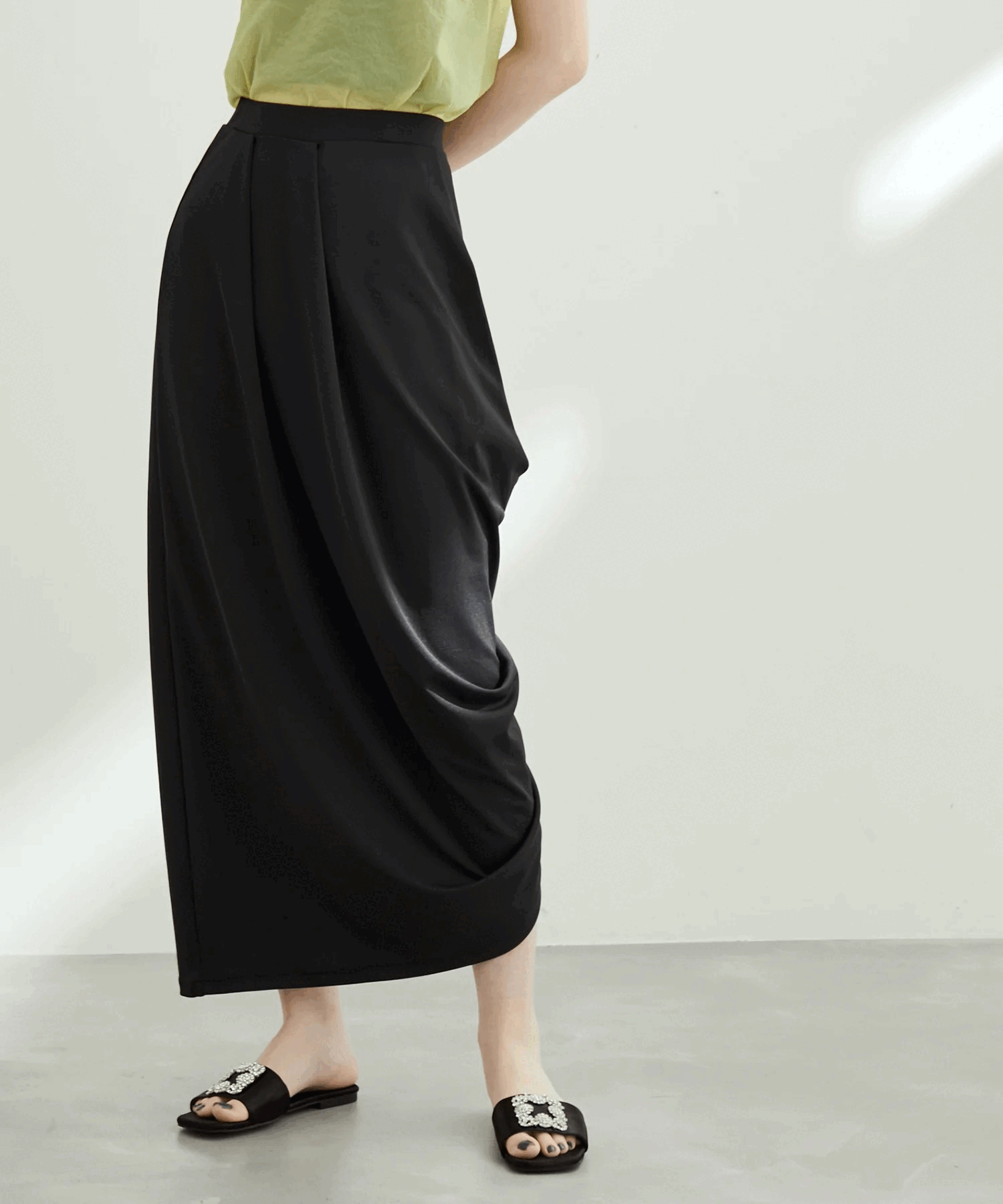 構築的なフォルムで女っぽく。ドレープの上品さと快適な着心地を兼備した、ジャージー素材のロングスカート。