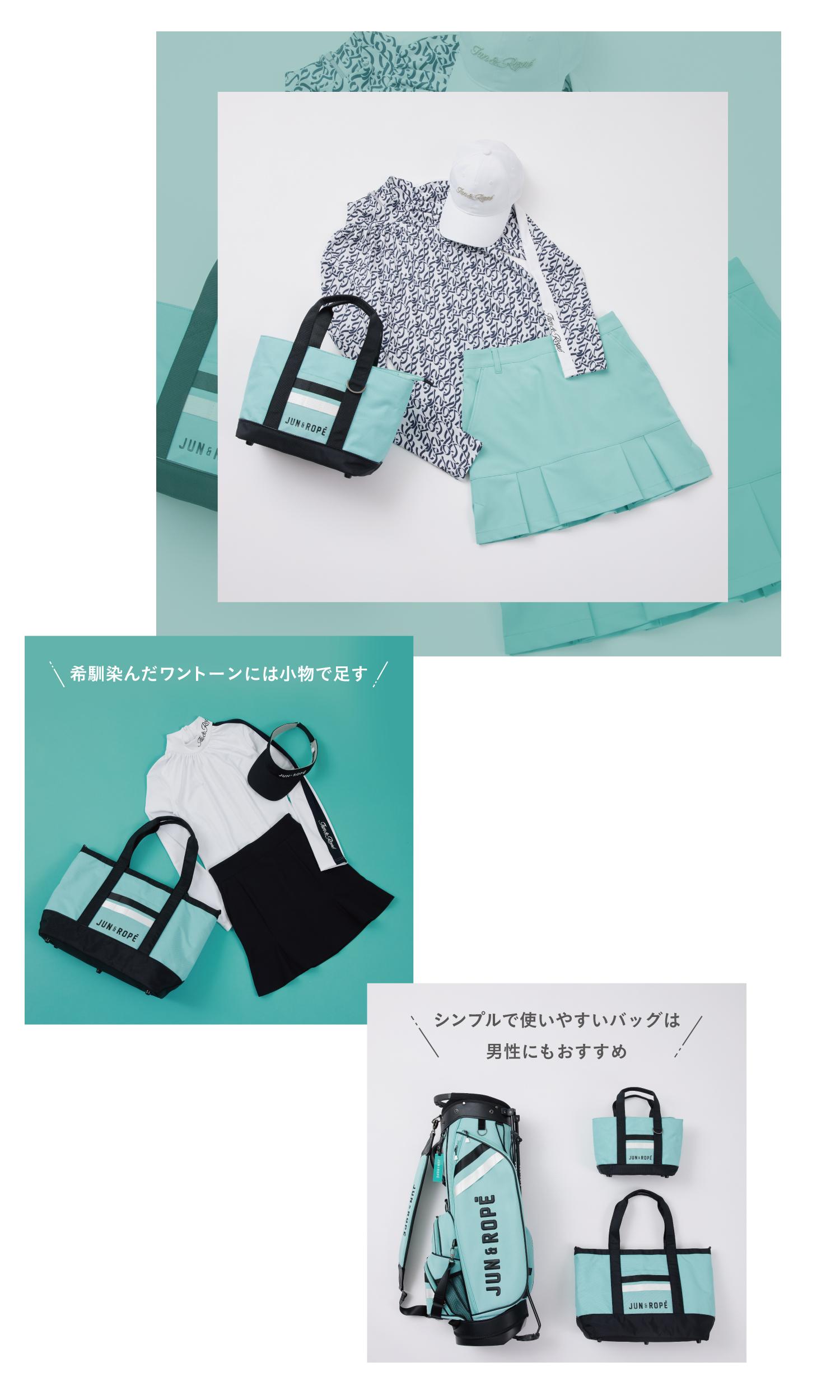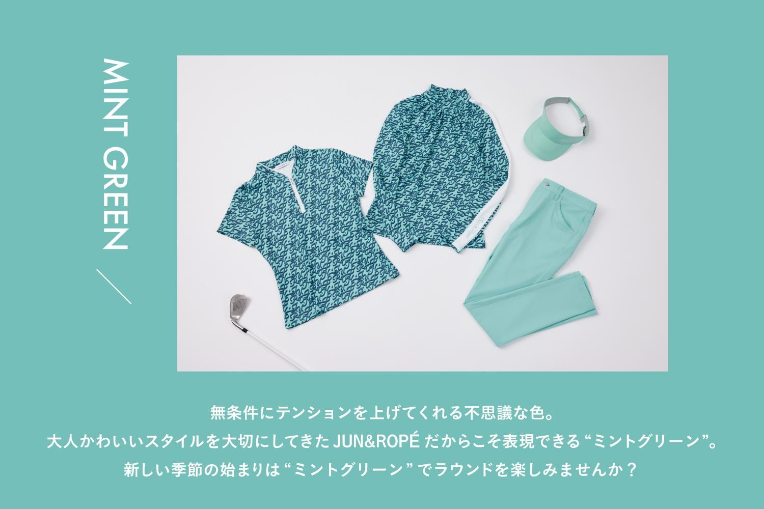 ゴルファーのトレンドカラーとしてJUN&ROPE'でも大人気の『ミントグリーン』。トレンドのくすみカラーの中でも、かわいさが際立つ。合う色を知って、おしゃれに着こなしてみましょう!