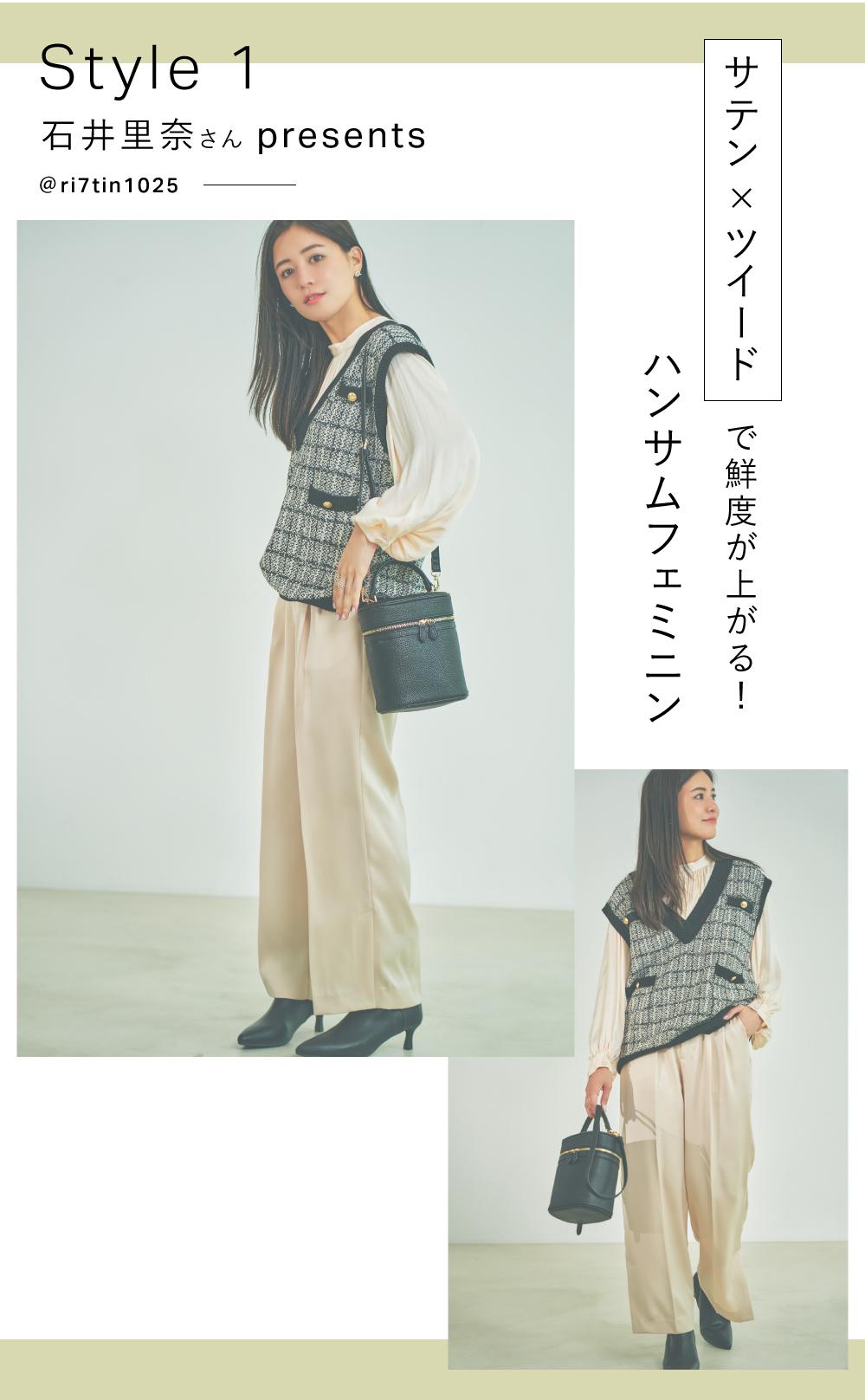 「まず、サテンの質感が着ていて気持ちいい。女性らしく見せてくれて、着心地もいいサテンは、お仕事で出番の多いアイテムです。それにメンズライクなツイードのベストを合わせて自分らしく。キレイめでいて、今年っぽさも出せるオフィススタイルになったかな、と思います。」