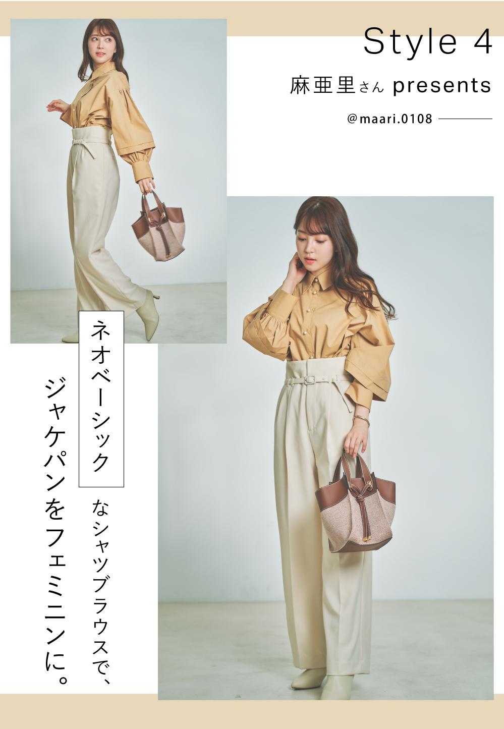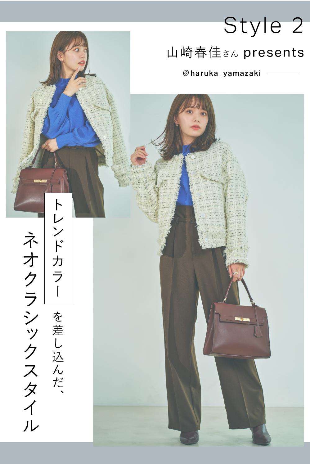 「明るい色のジャケットは、顔まわりが明るく見えるから、特にオフィスには最適な好感度の高いアイテム。オフの日なら、デニムに合わせますが、お仕事スタイルということで、フラノのワイドパンツを合わせました。インナーに差し色を持ってくることで、今年っぽいコーデになったと思います。」