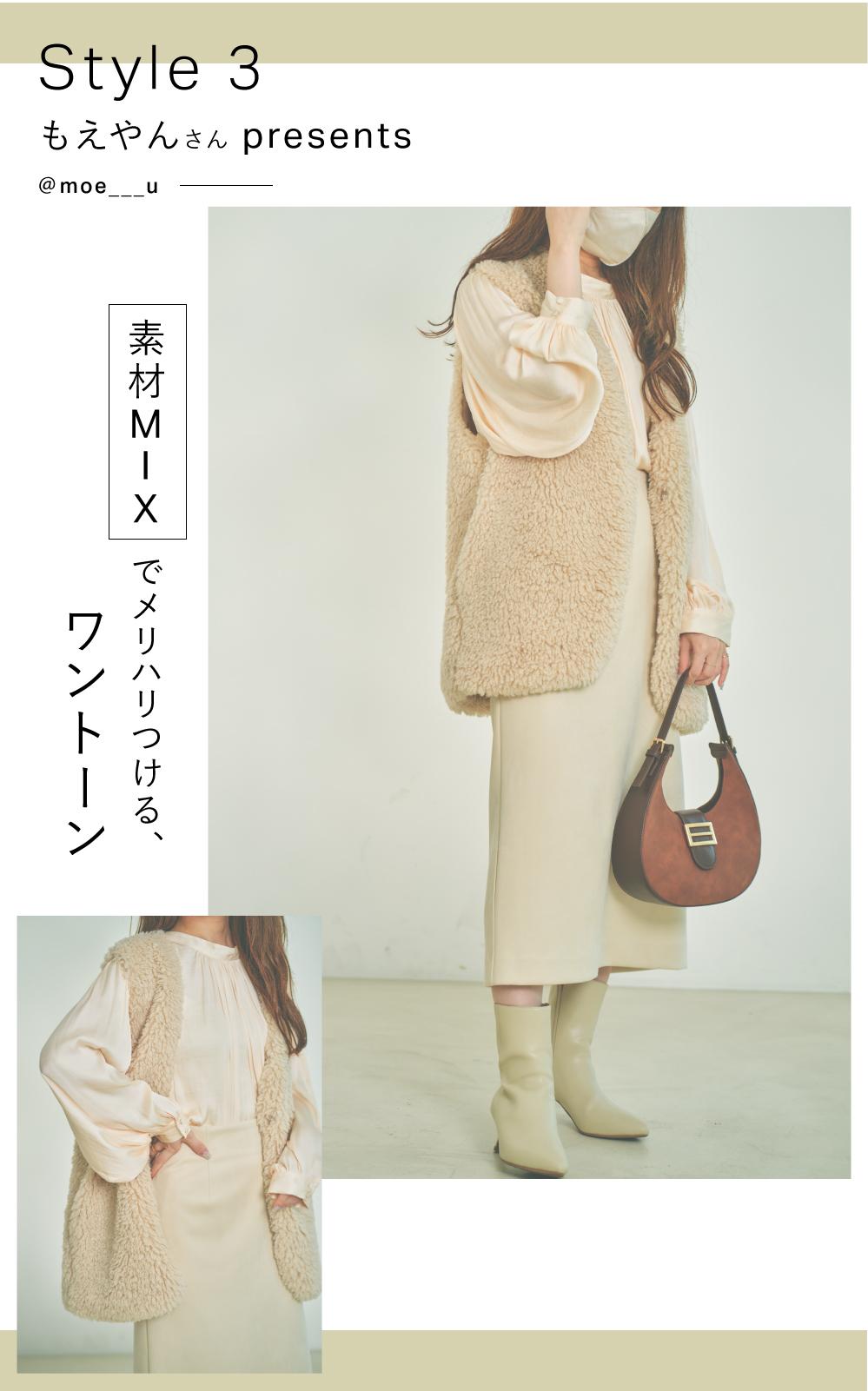 「このコーデのポイントはなんと言ってもファーベスト。ファーベストをベージュのワントーンで大人っぽくキレイめに合わせたので、オフィスでも対応できるかな、と思います。そしてこのファーベスト、何より軽い! お仕事中でも気にならないし、ジレ感覚で気軽に羽織れるのが嬉しいです。」