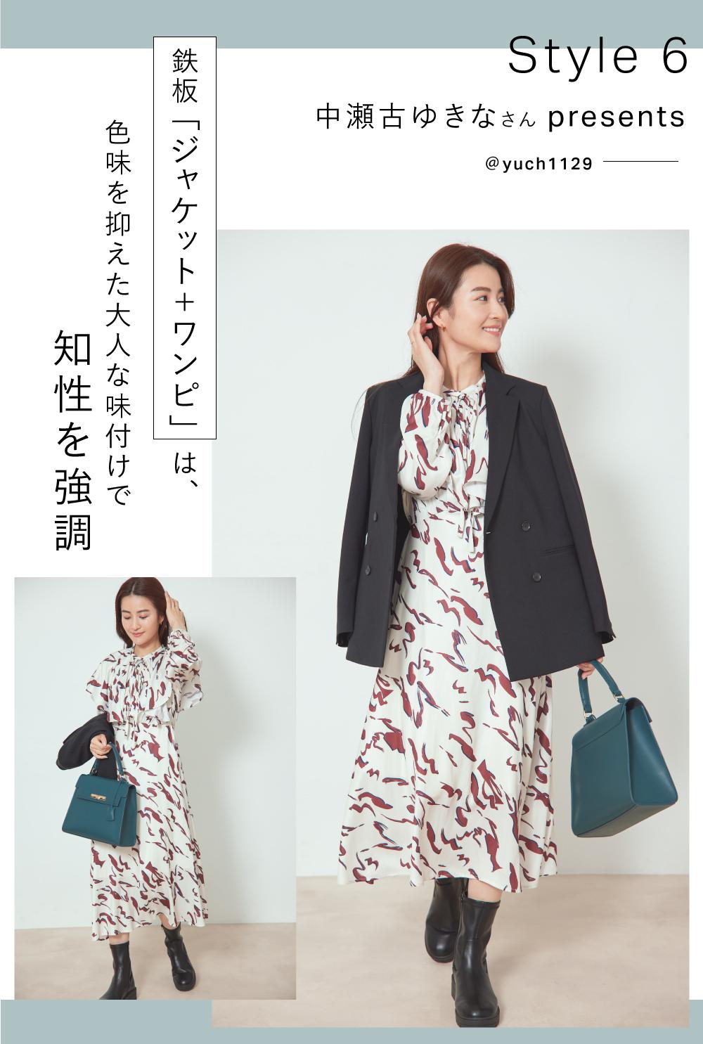 「ワンピースは、襟の取り外しで印象が変わる2WAY。ONOFFはもちろんですが、仕事の内容や会う方に合わせて雰囲気が変えられるのが嬉しい。総柄ですが、ベースが白だし抽象的なイメージなので、清潔感があり大人っぽく、知的な雰囲気に見えるのも、働く女性には最適だと思います。秋すぐに着られて、オフィス仲間にも褒められそう!」