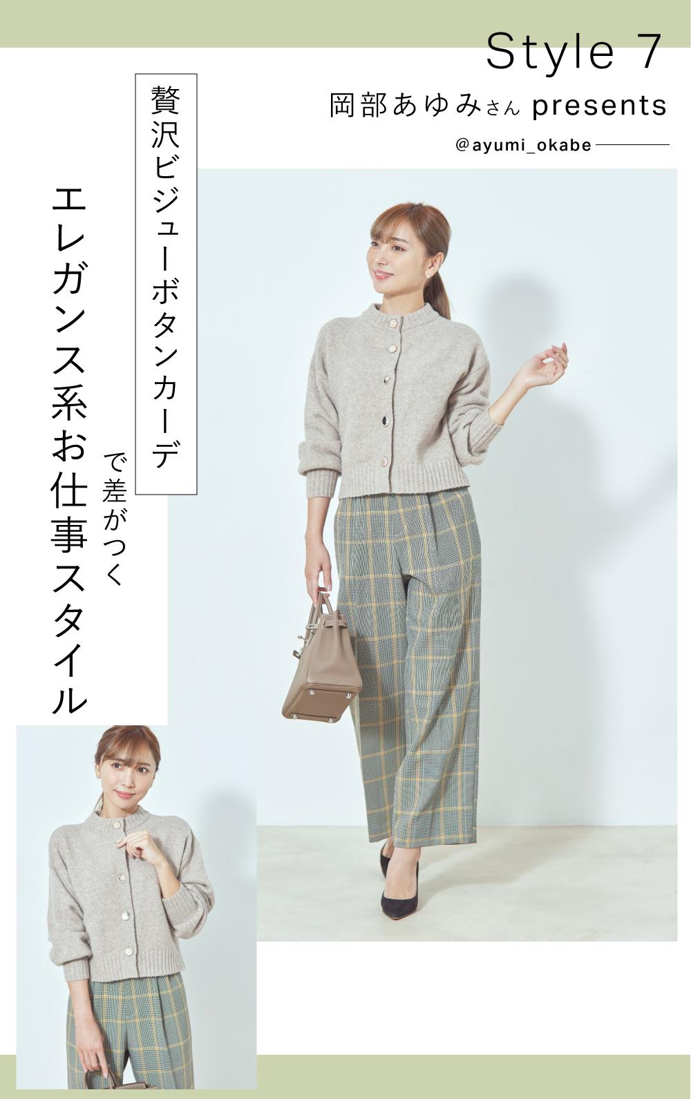 「このニット、サイズ感が絶妙なんです。一枚で着ても、重ねてもキレイ。モコモコかわいい質感なのに、着膨れしないのは、シルエットがキレイだから。ひとつずつ違うデザインのボタン使いが贅沢で、何より高見えするから、お仕事はもちろんだけど、きちんとした席にもぴったり。今季狙っているチェックアイテムと合わせて、ワントーンの中にもメリハリをつけてみました。」