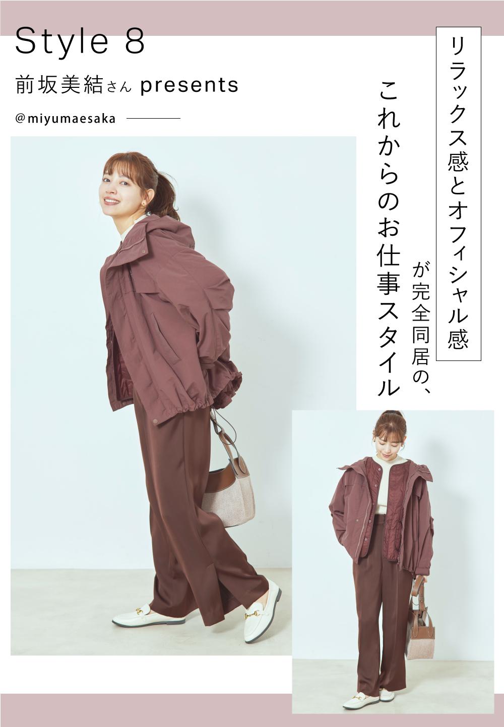 「マウンパなどのアウトドア・ユースなアイテムを普段コーデに取り入れるのが好き。このoutdoorとコラボのマウンパは、やりすぎてないデザインと色味がタウンユースにぴったり。サテンパンツと合わせることで、今っぽいお仕事スタイルになったと思います。取り外しの出来るインナーダウンもインセットになっているので、大好きな冬の旅行やアウトドアにも活躍してくれそう!」
