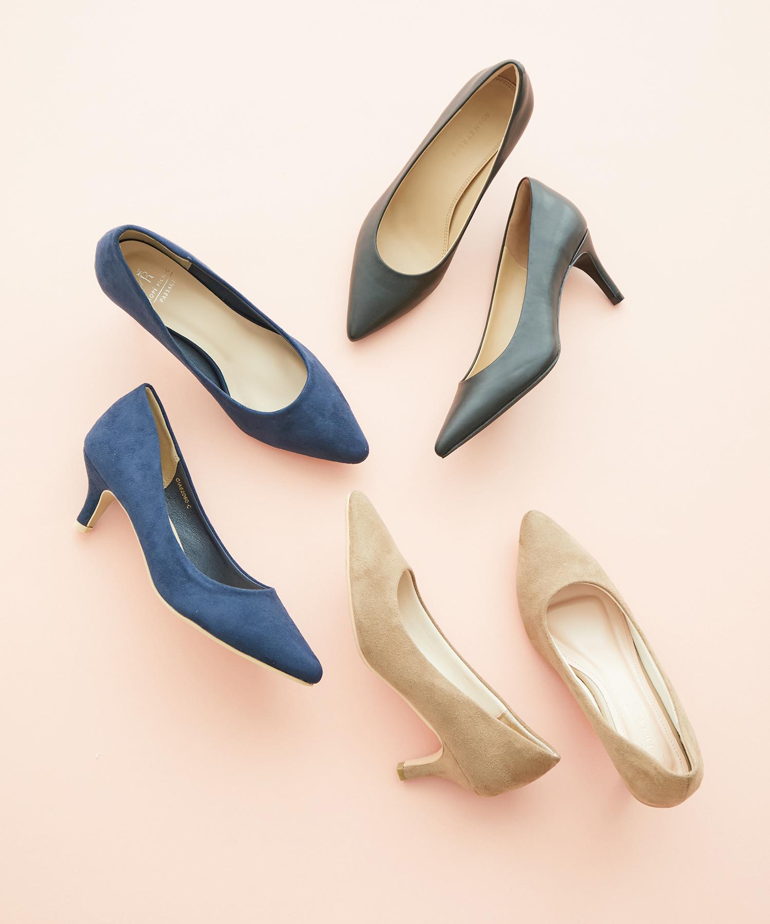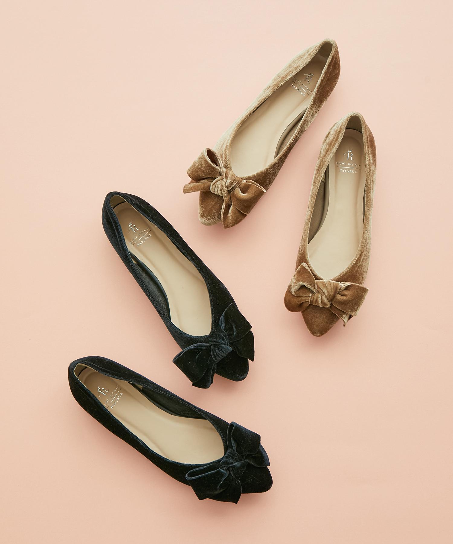 高級感のあるベロア素材でクラシックなフェミニンスタイルの完成。足元から品の良い女性らしさを演出してみて