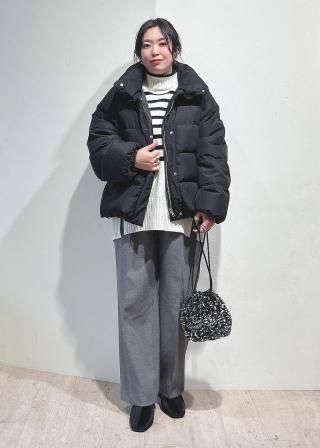 毎シーズンの『VIS』のダウンは、地球環境に優しいリサイクル羽毛を使用したグリーンダウン。一度使用された羽毛を回収、洗浄や回復処理を経て再利用します。シンプルながらも、衿を開いたときはもちろん、今シーズントレンドのスタンドカラーにして着ても、すっきりと小顔に見えるのがこだわり。ストレートさんがダウンを選ぶ場合は、このようにボリュームがあるけれど適度に抑えられていることと、少し長めの丈であることを意識してみて。裾口から入る冷気を軽減し、シルエットも整えられるように、ドローストリングスでスソ周りを調節できます。