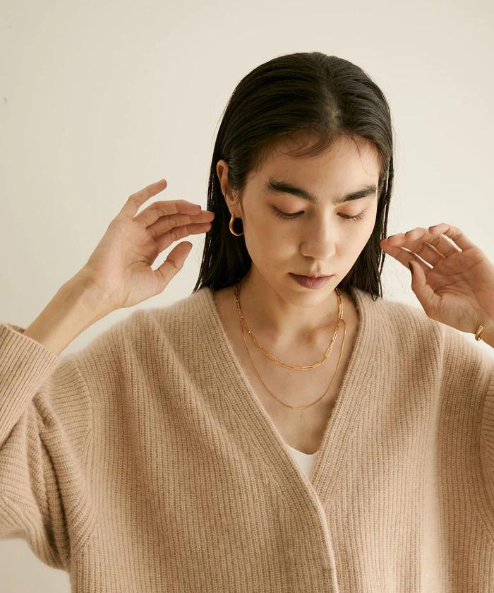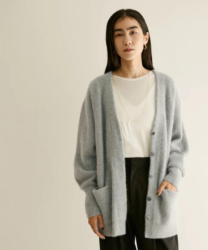 保湿性に優れ、柔らかさと美しい表情を持つフォックス混の糸を畔編みで仕上げたニットカーディガン。