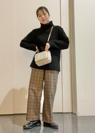 右:ゆったりニットならなんでも似合うナチュラルさんだけれど、とくにゆったりしたオフタートルは得意分野。表情のある畦編みや、体のラインをカバーしてくれるシルエットとの相乗効果も楽しめます。素材は、環境に優しいリサイクルポリエステル。日常使いに便利な、クリーンな印象のボーダーも、大人カジュアルにぴったりです。