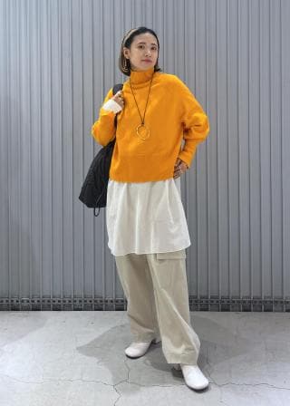 後ろ下がりのハイネックは、フロントの丈の短さと、首回りのゆったりぐあいがウェーブさんに似合うポイント