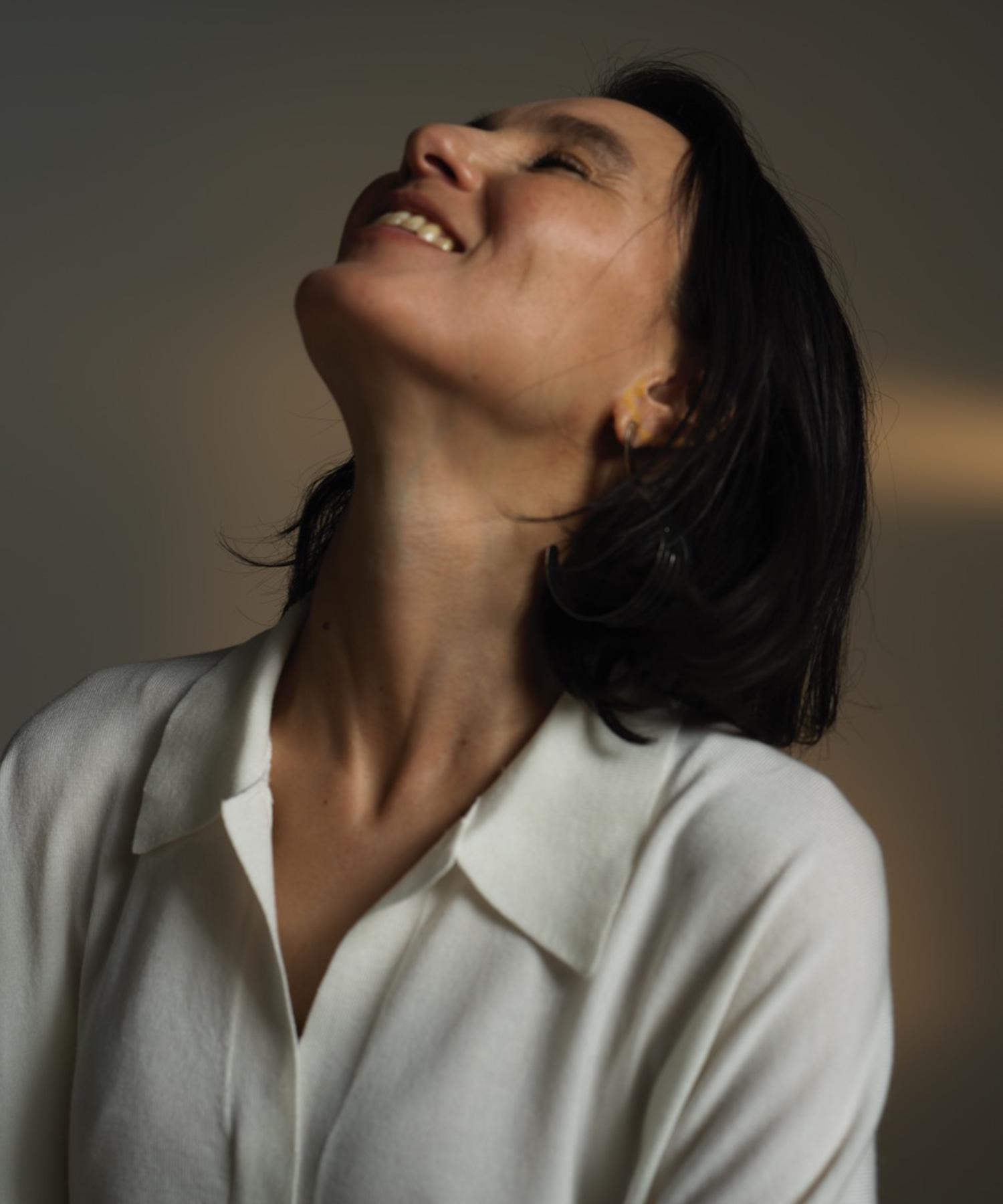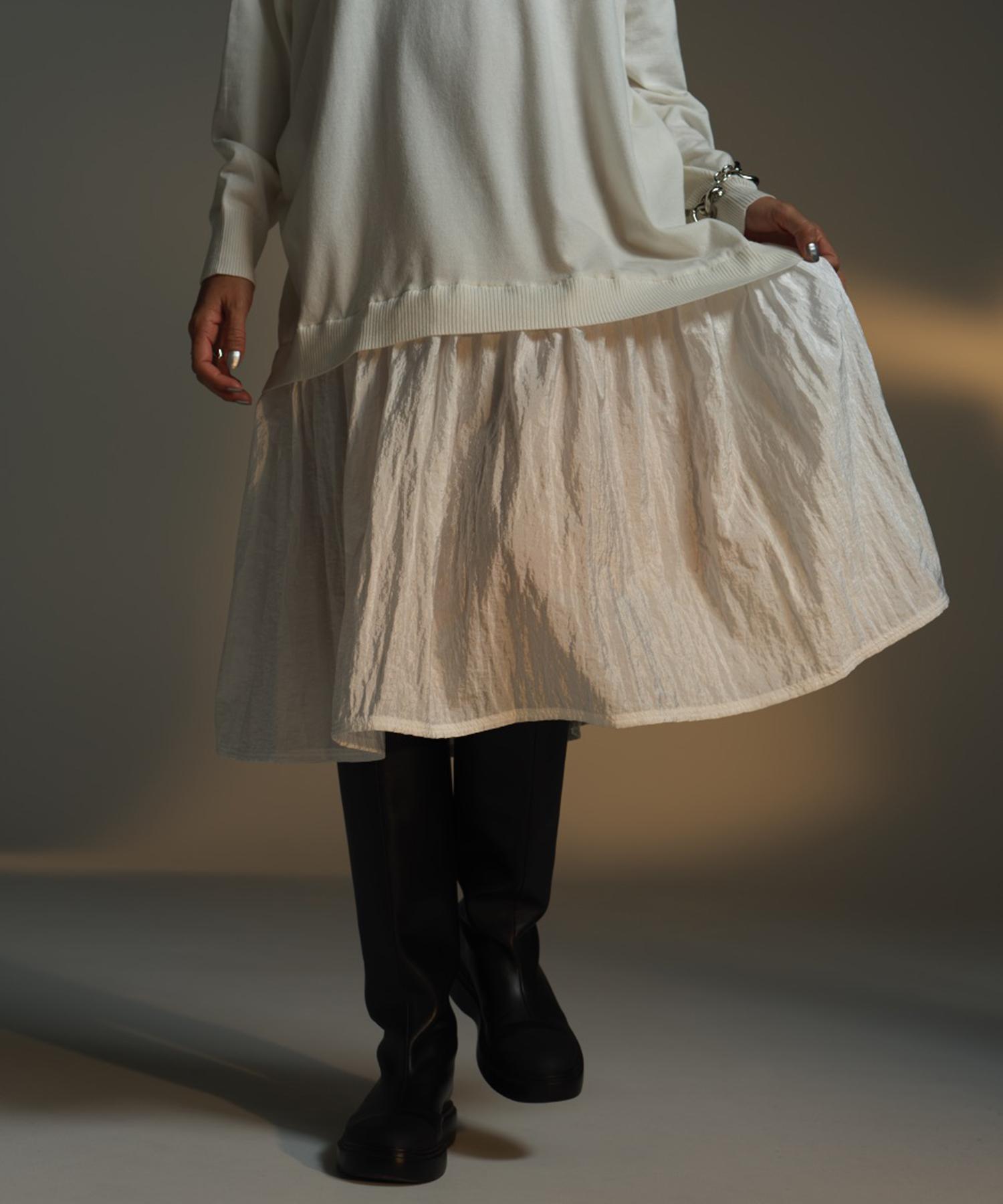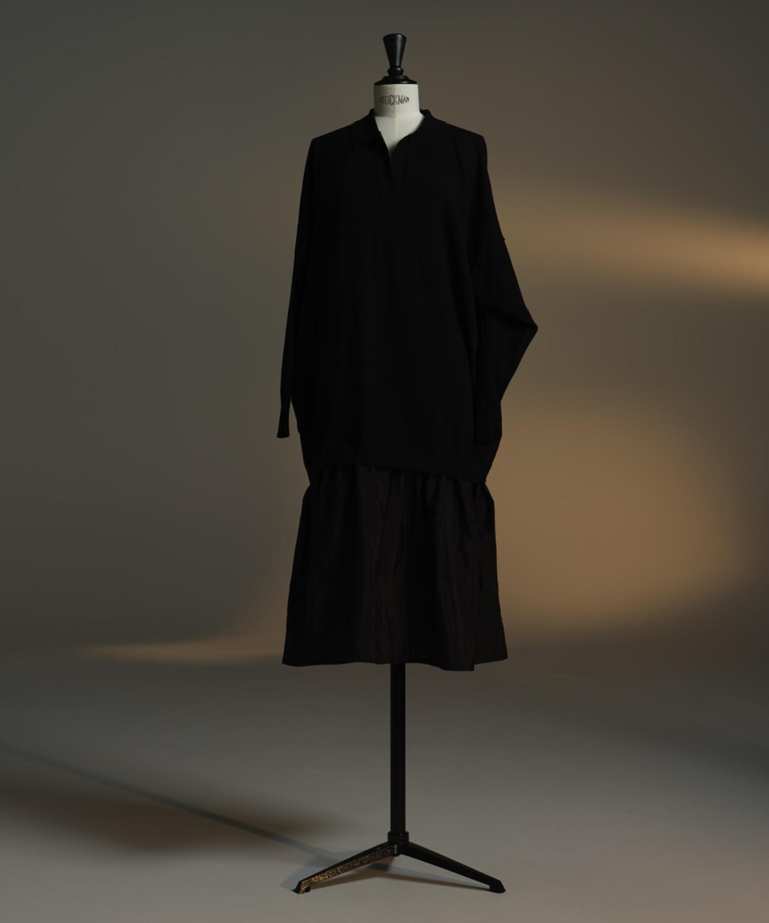 ポロカラーがスポーティでマニッ シュな印象でありながら、ドレープ がエレガントなバルーン裾