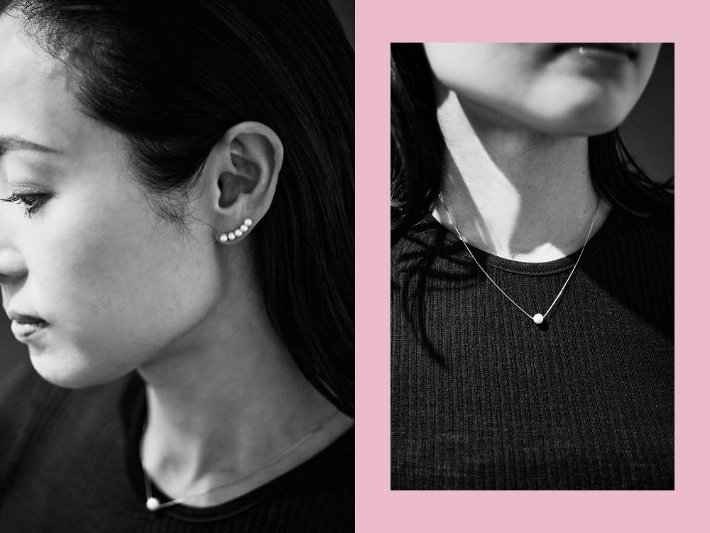 1粒のピンクパールに繊細なベネチアンチェーンを通したシンプルなショートネックレスと、5粒のピンクパールがオリジナルカーブを描くデザインピアス。