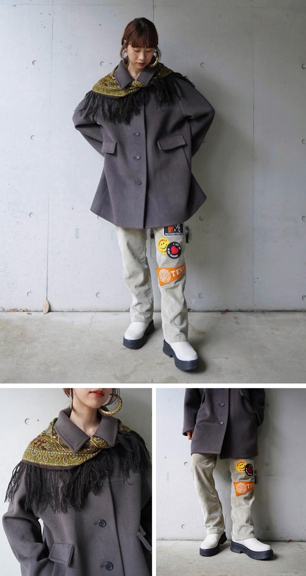 オーバーサイズのアウターはメンズライクな印象なので、vintageスカーフとワッペンで遊び心をプラスしました。