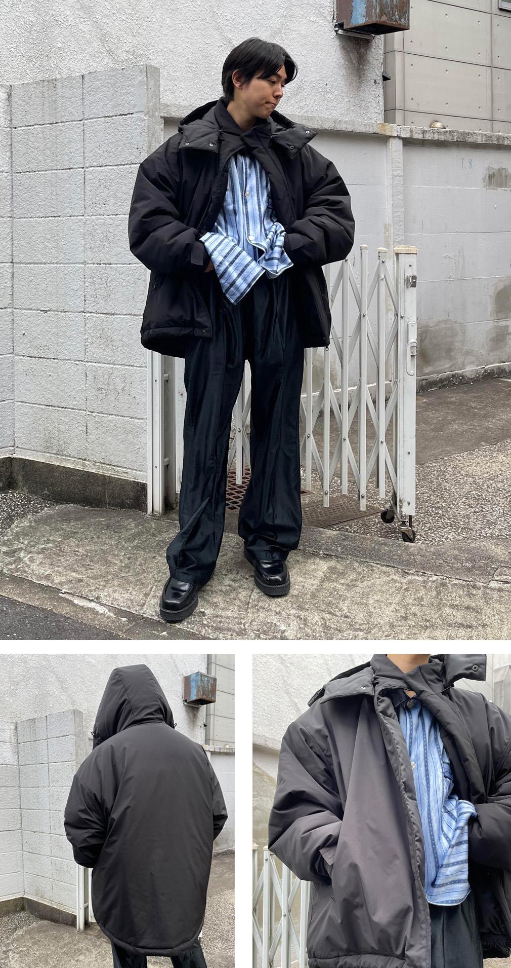 ボリューム感のあるブラックのダウンなので、シャツのサテンの生地感とブルーの色で明るさを出し、パンツをブラックの軽やかさ素材のものにしてバランスをとりました。(吉川さん)
