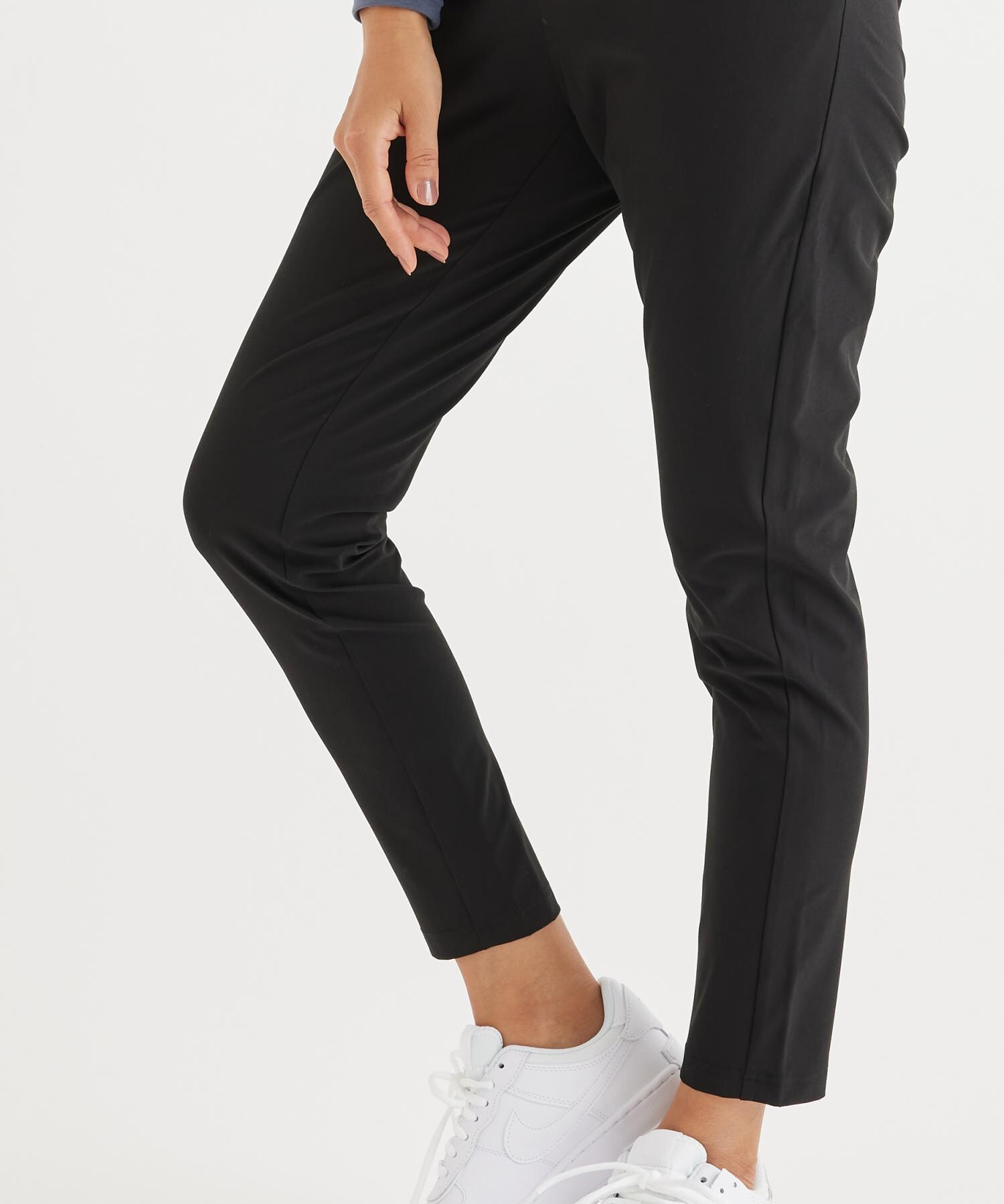 ストレッチ性のある素材のテーパードシルエットのパンツ。