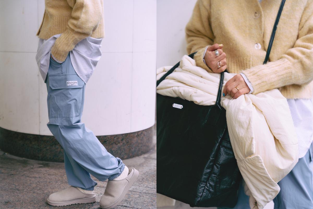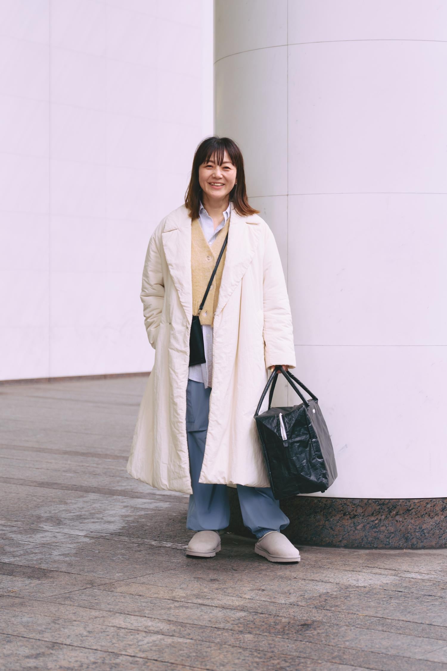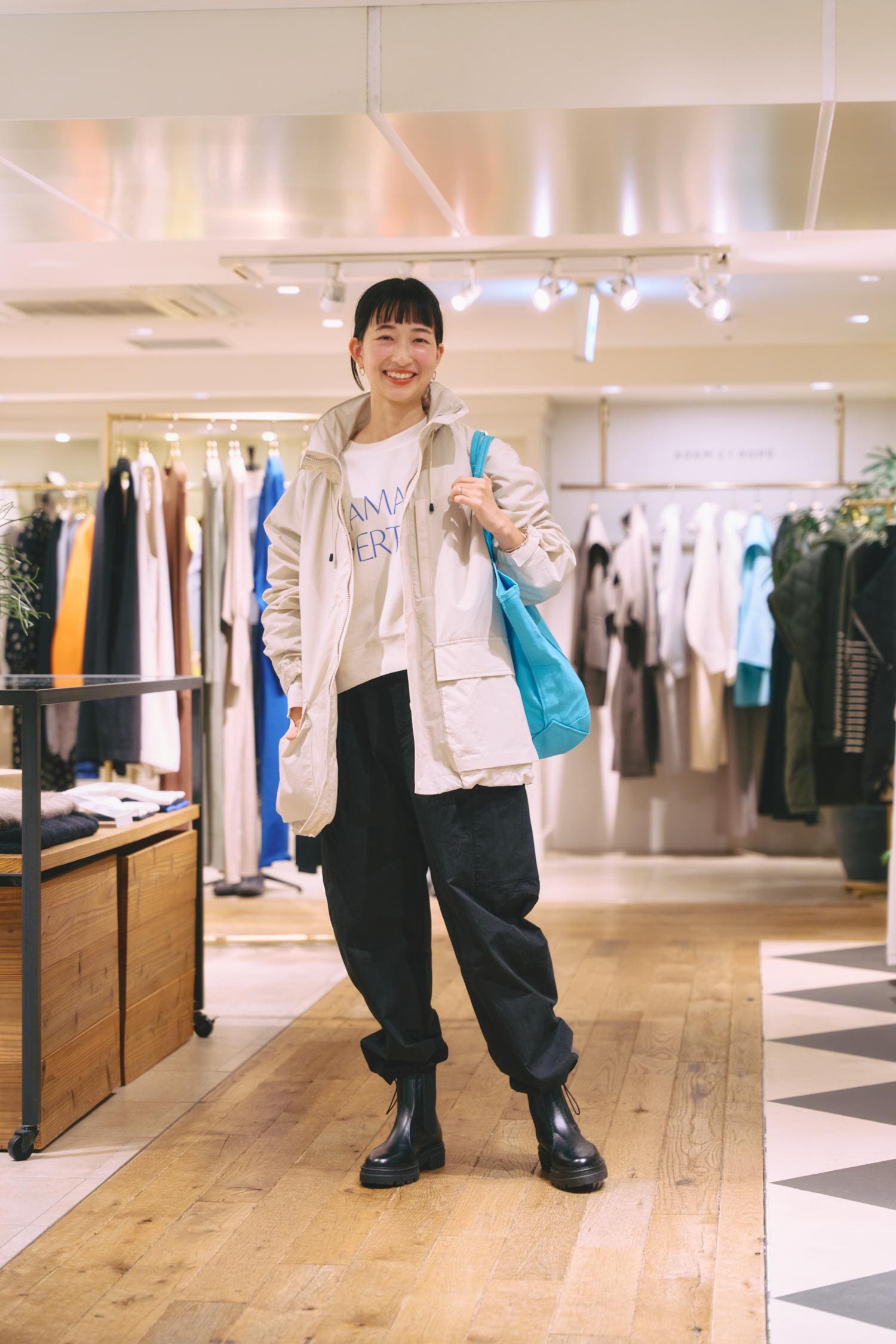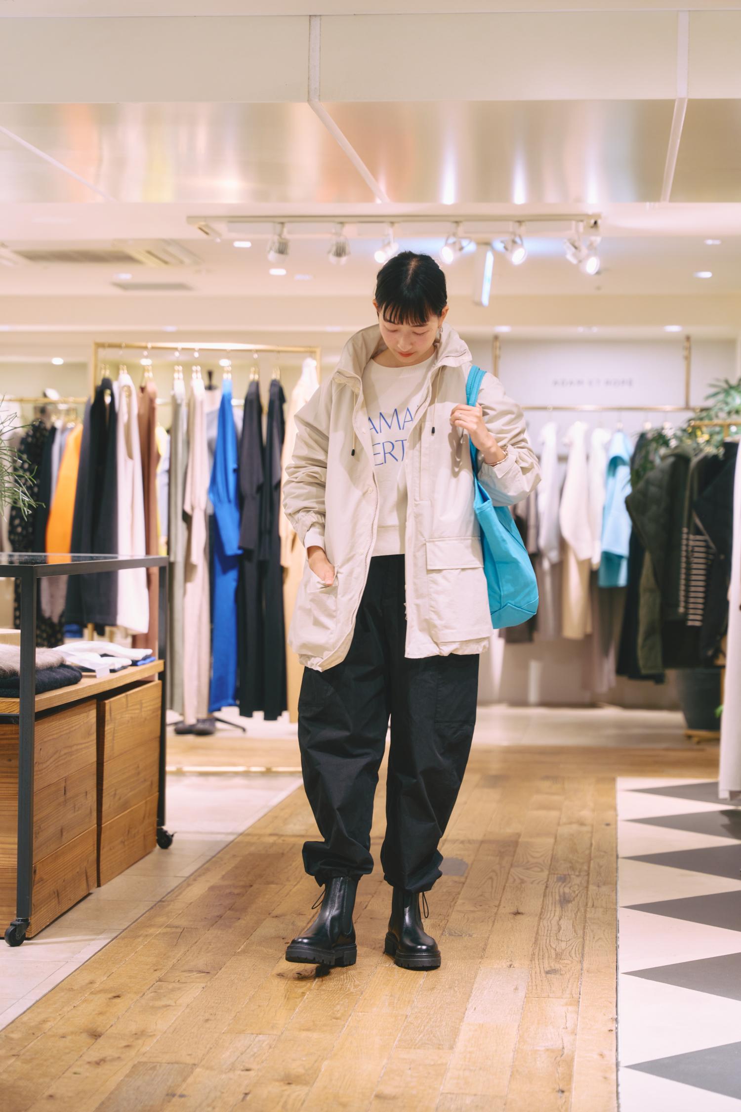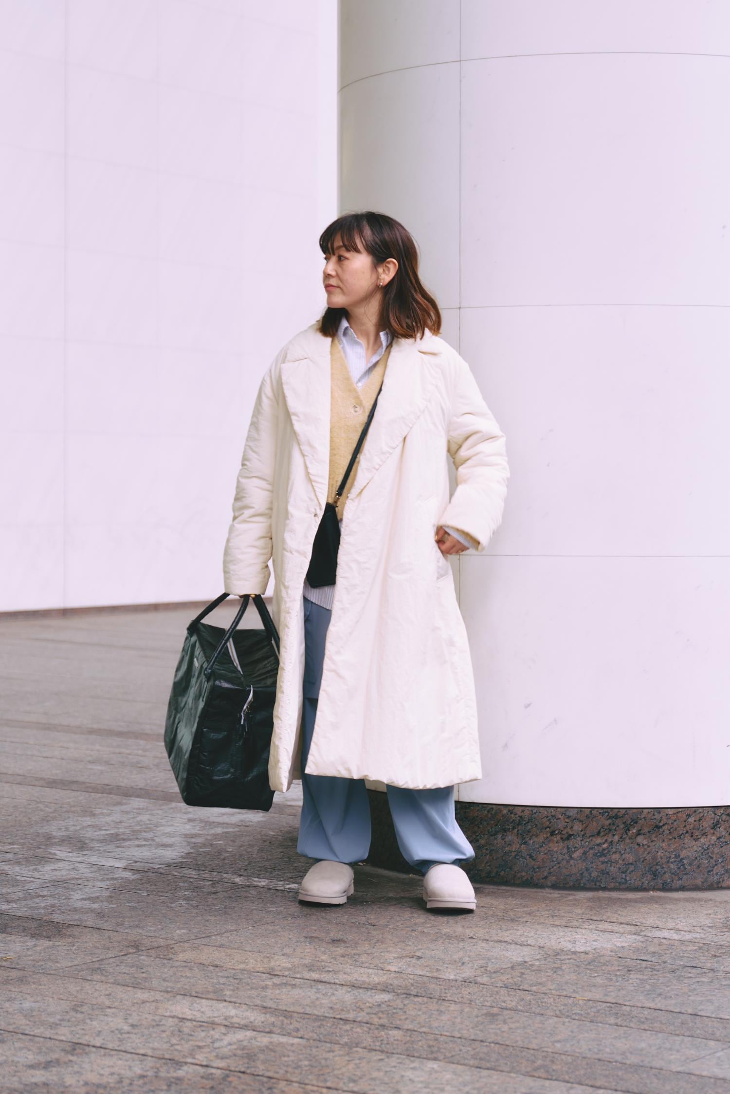 寒い温泉地でも心配なく過ごせる、軽くて暖かい中綿ロングコートをアウターに、撥水加工を施したAmericana別注のイージーカーゴパンツと、春らしいイエローをアクセントにした今季トレンドのシャギーカーディガンをコーディネート。バッグは軽量で耐久性にも優れたポリエチレン素材のオールドマンズテーラーのボストンと、スマホや必要なカード類、お札等も畳んで収納可能なスマホポシェットをサブバッグとしてチョイス。アクティブで動きやすいスタイリングが特長です。