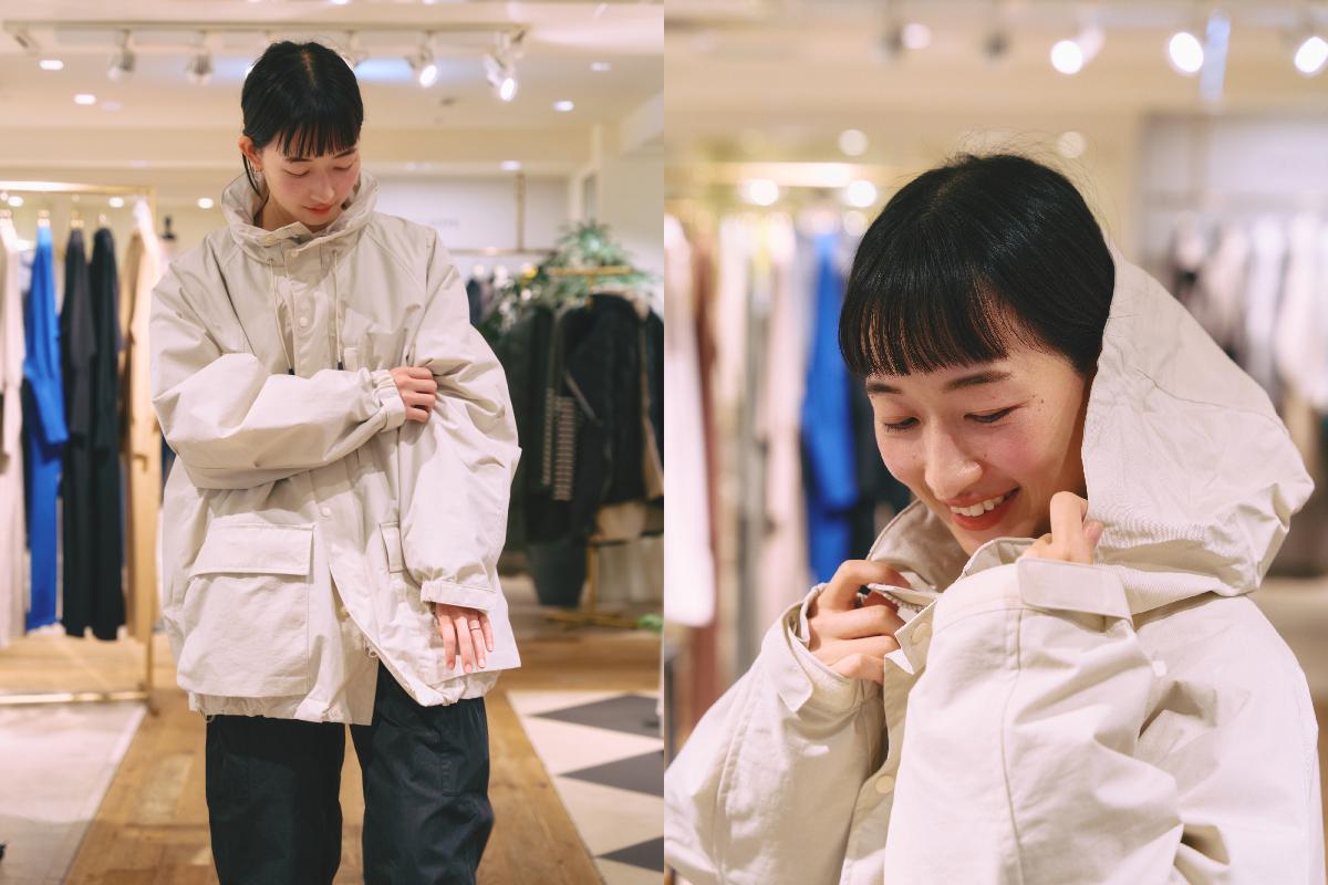 コートはホワイトをチョイス。グランピングなどの外のアクティビティでは敬遠されがちなカラーですが、撥水加工されているので汚れても、安心。また、防風加工もされているので、肌寒い時でも快適に暖かく過ごせます。