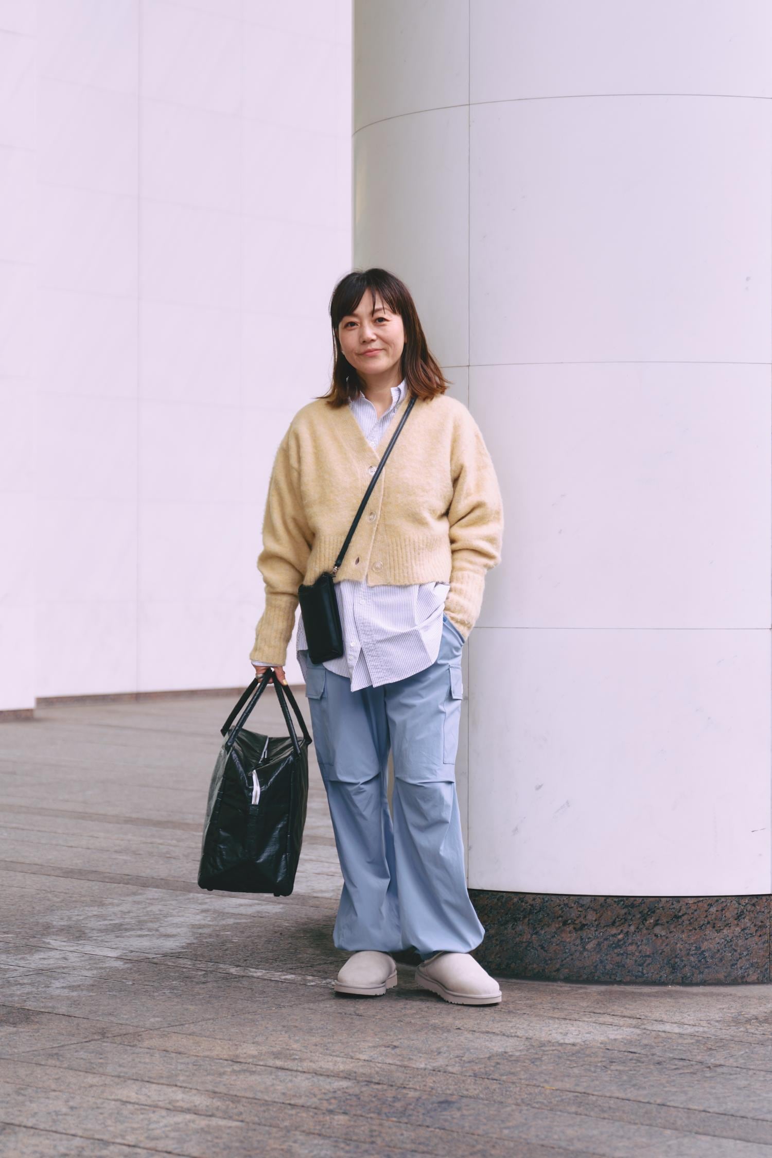今季トレンドのヘアリーなシャギー素材とボリューム袖、長めのリブデザインが女性らしいカーディガンは春らしさを感じるイエローカラーをチョイス。暗めになりがちな冬スタイリングに春らしいカラーをプラスし、明るい印象に。また、ちょっとした観光に便利なスマホポシェットも必須アイテムです。