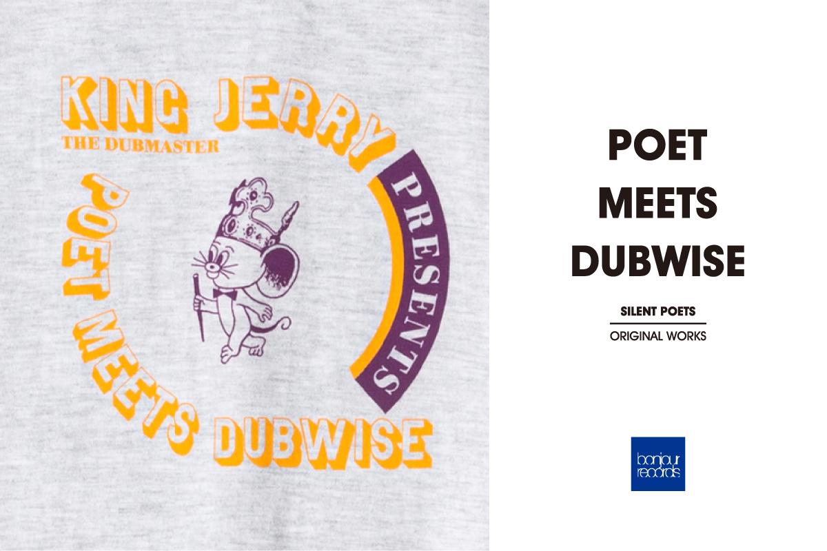 SILENT POETSから連想されるキーワードをタイポグラフィとしてプリントしたブランド定番のSWEAT類や、イラストレーターとして活動中のジェリー鵜飼氏のキャラクター「JERRY MARQUEZ」とPOET MEETS DUBWISEのコラボレーションによって生まれた、DUBの王様キング・タビーにちなんだ新たなキャラクター「KING JERRY」をプリントしたS/S Tee、PULLOVER HOODIEが登場。