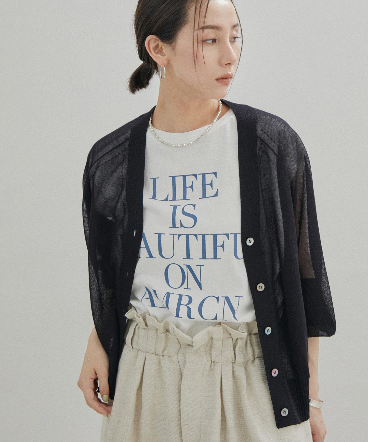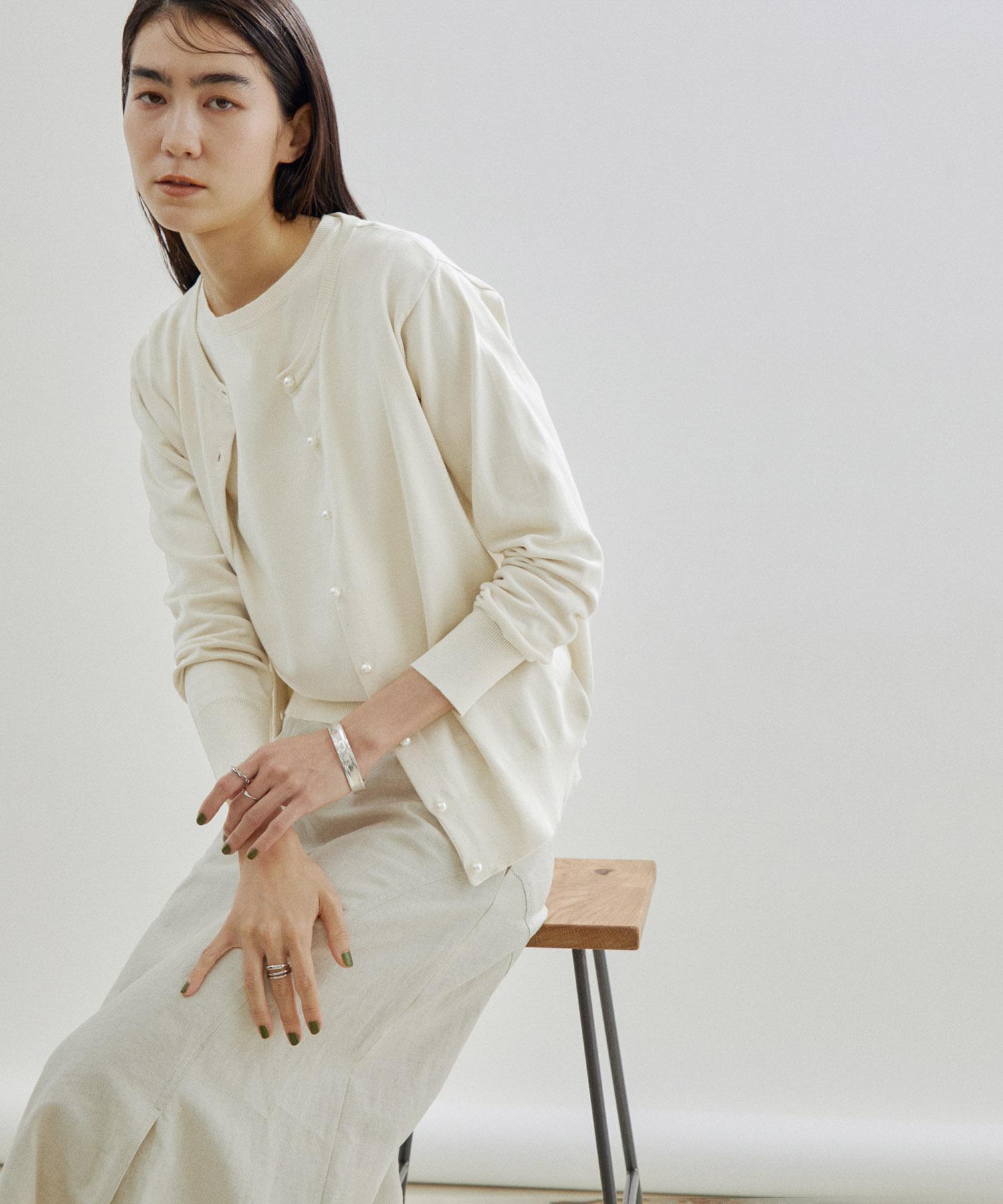 半袖ニットは少し長めの五分袖とクルーネックが落ち着いた印象。カーディガンはパールボタンが華やかな女性らしいデザインです。
