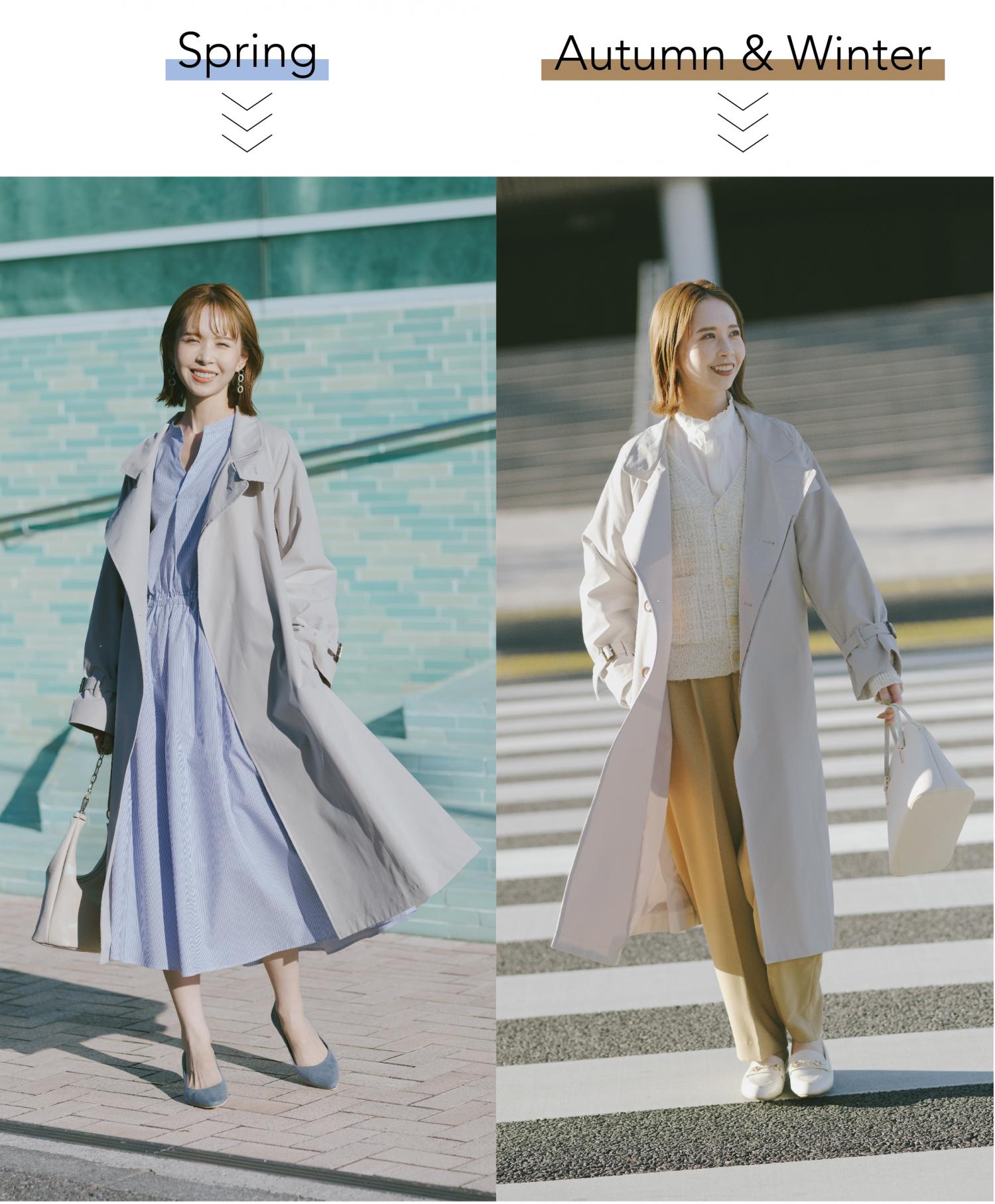 ハリ感のある素材でクールな印象のスタンドカラーコートは、襟のボタンを外してトレンチ風の着こなしも楽しめる2WAY仕様。立ち襟は肌寒さを感じる時の防寒対策にも◎。花粉ガード機能付きの、春にぴったりな一着。