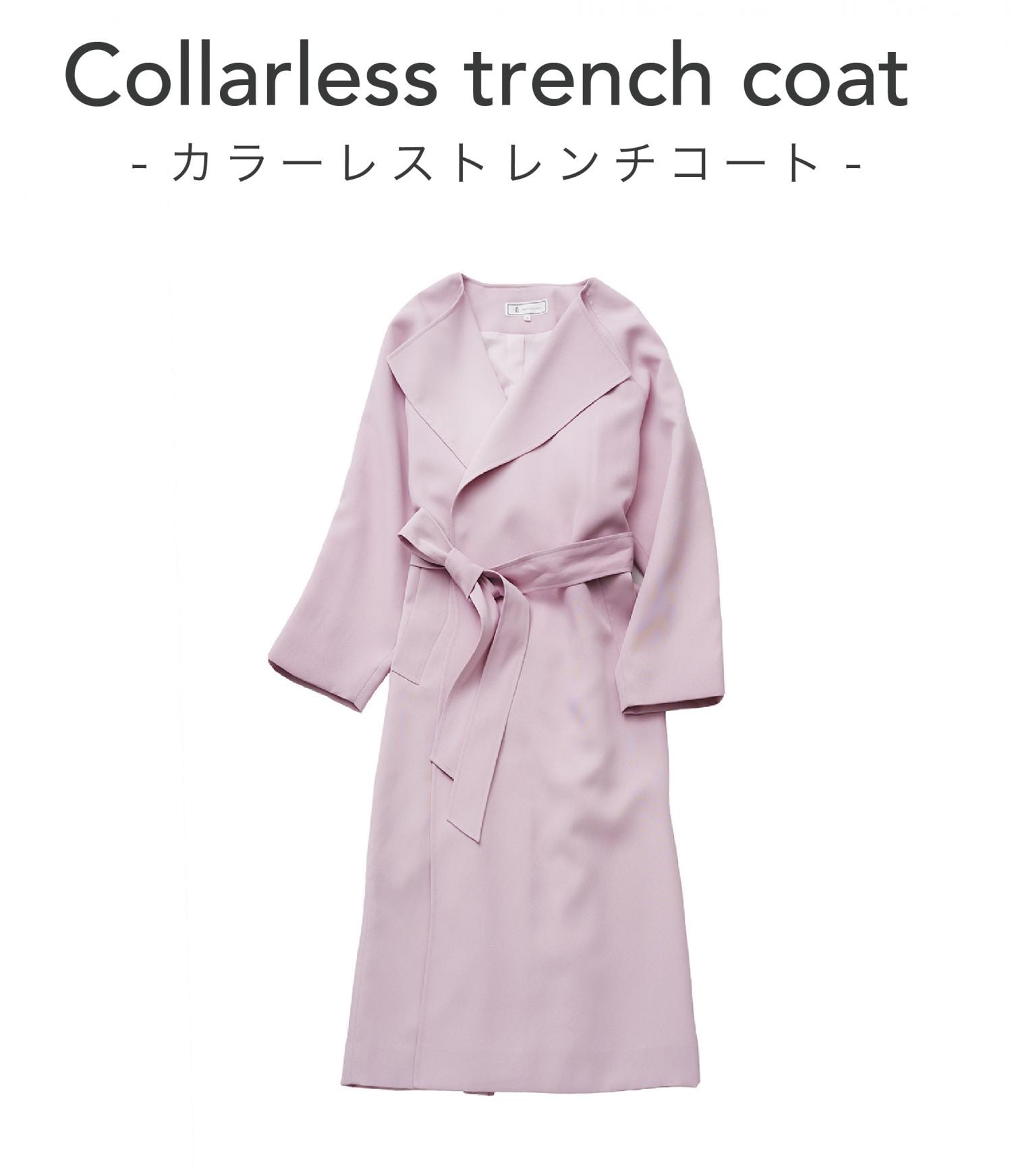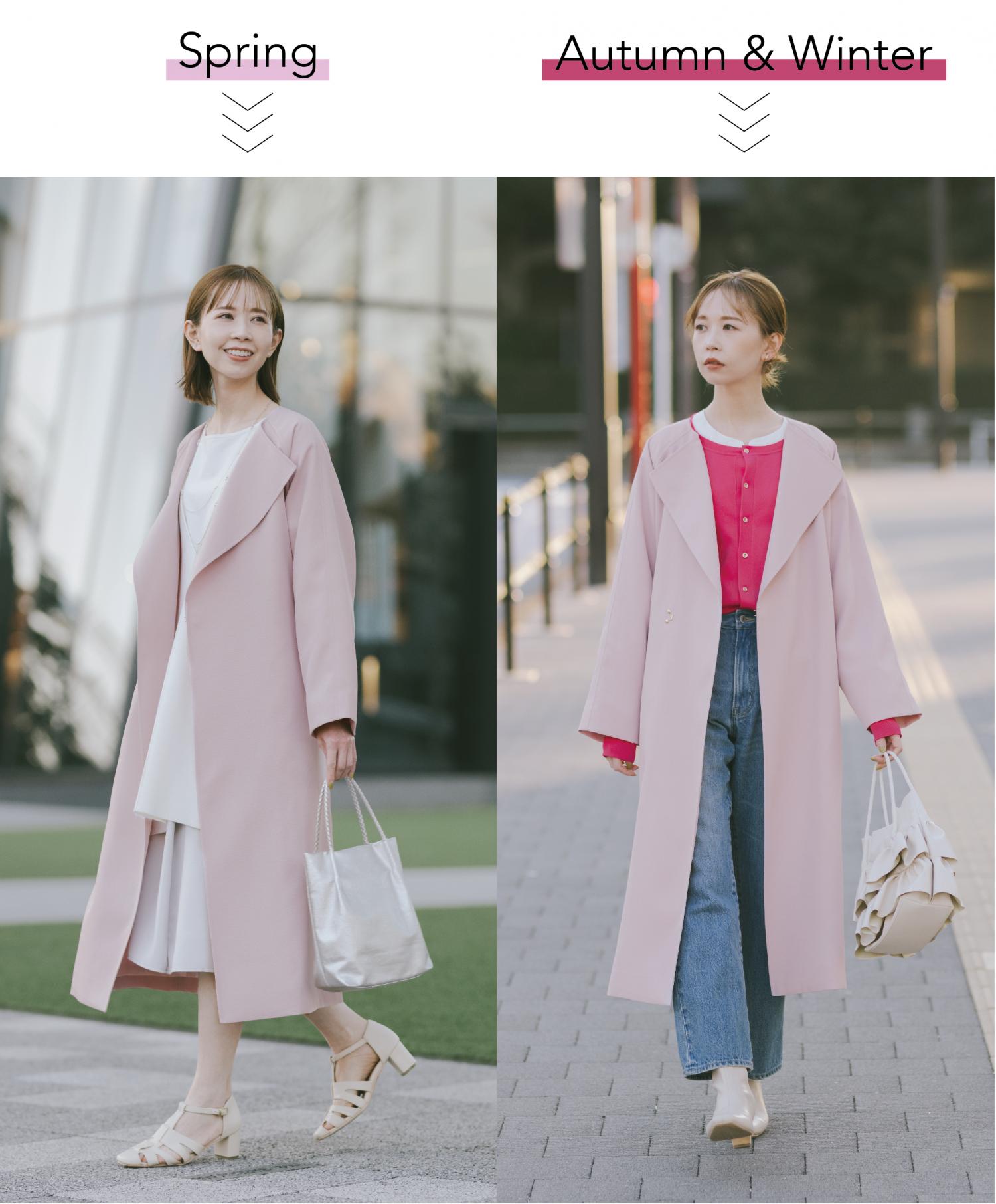 しっかりとした生地感で上品さを感じさせるノーカラーコートは、シワになりにくいポリエステル100%。ウエストベルトは後ろで結ぶとすっきりとしたシルエットに。スカートにもパンツにもバランス良くマッチ◎。