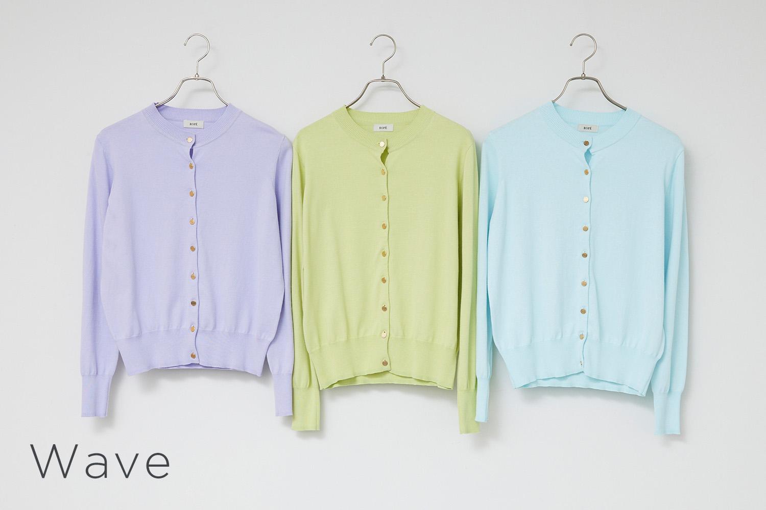 (右)オーガニックコットンを使用したやわらかな質感のカーディガン。花やパールなどのデザインをあしらった飾りボタンがアクセントに。足し算スタイルを得意とするウェーブは、装飾のあるトップスが似合うのも特徴。ボタンをしめてニットとして着るのもオススメ。