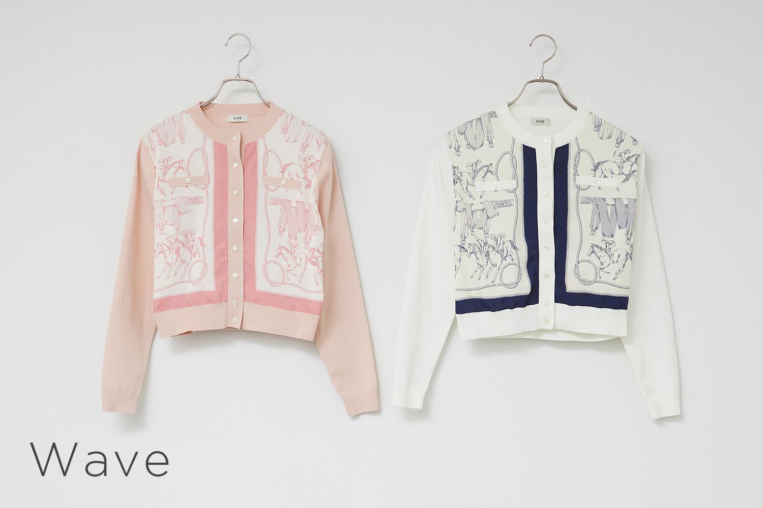 ニットとシルクライクなスカーフのコンビが上品なカーディガン。コンパクトなサイズ感、小さなボタン、薄手のやわらかな素材、プリントがまさにウェーブ向き。さらにクロップド丈が、重心バランスが下めの、ウェーブタイプのスタイルアップも叶えます。1枚で存在感があるので、シンプルなワンピースに羽織ったり、ボタンをしめて主役ニットとして着こなしたり、と幅広いコーデが楽しめます。