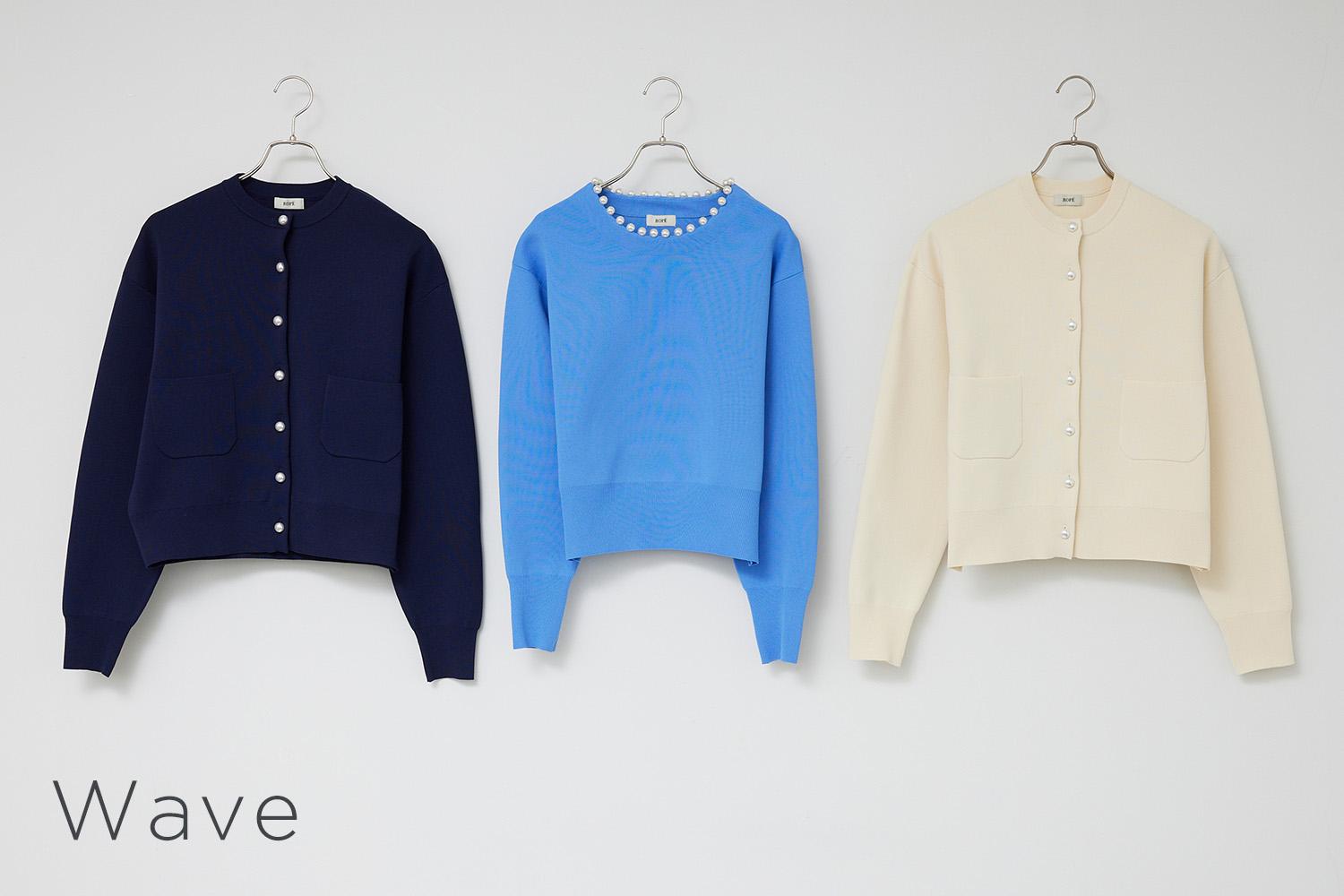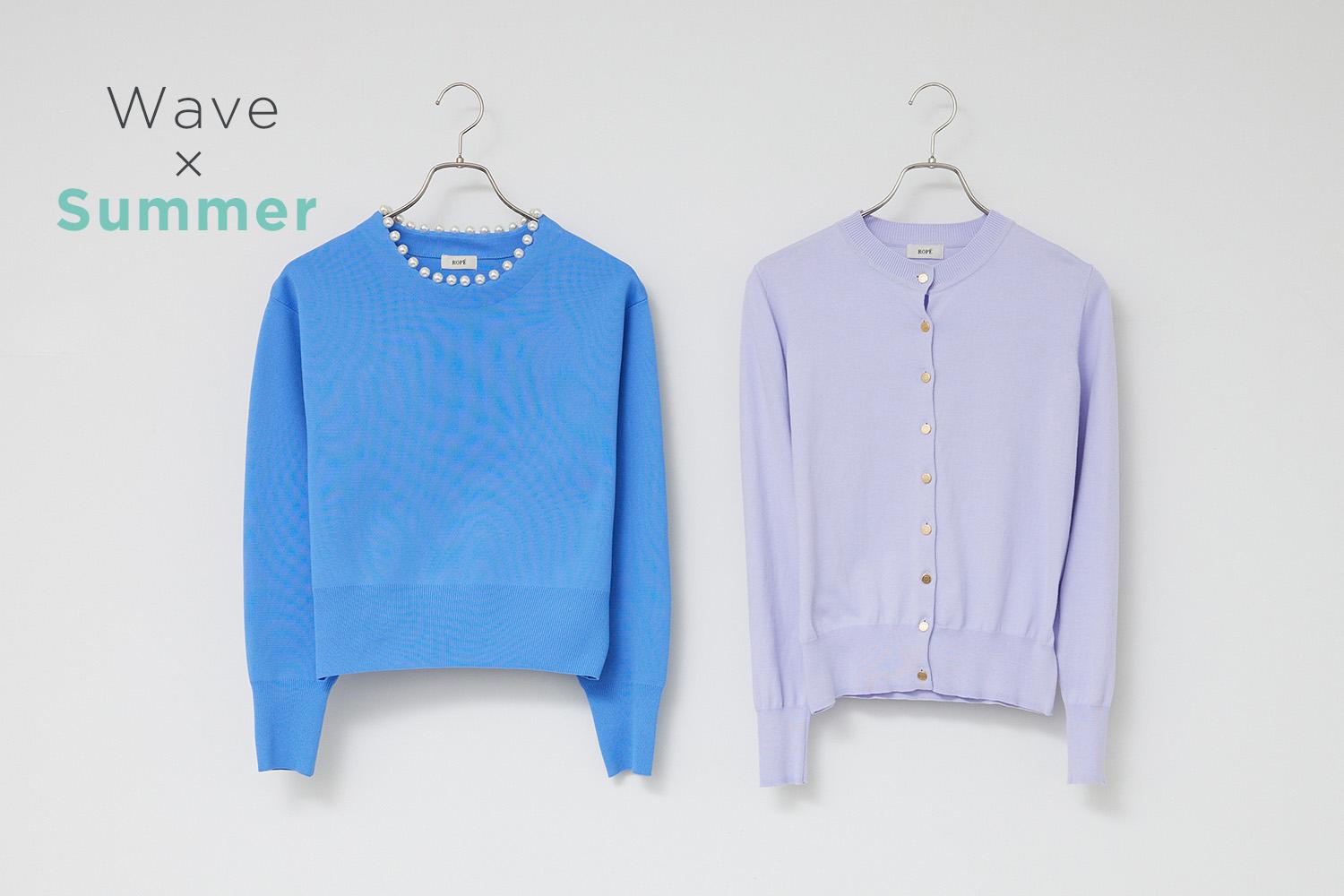 (左)品のあるミルキーなブルーは、まさにサマーにぴったり。サマーが持つ色白の肌になじみ、透明感のある知的な印象に仕上げます。アクセいらずで1枚でキマるパールつきのニットは、上半身を華やかにみせたいウェーブにとっても最適なアイテムです。