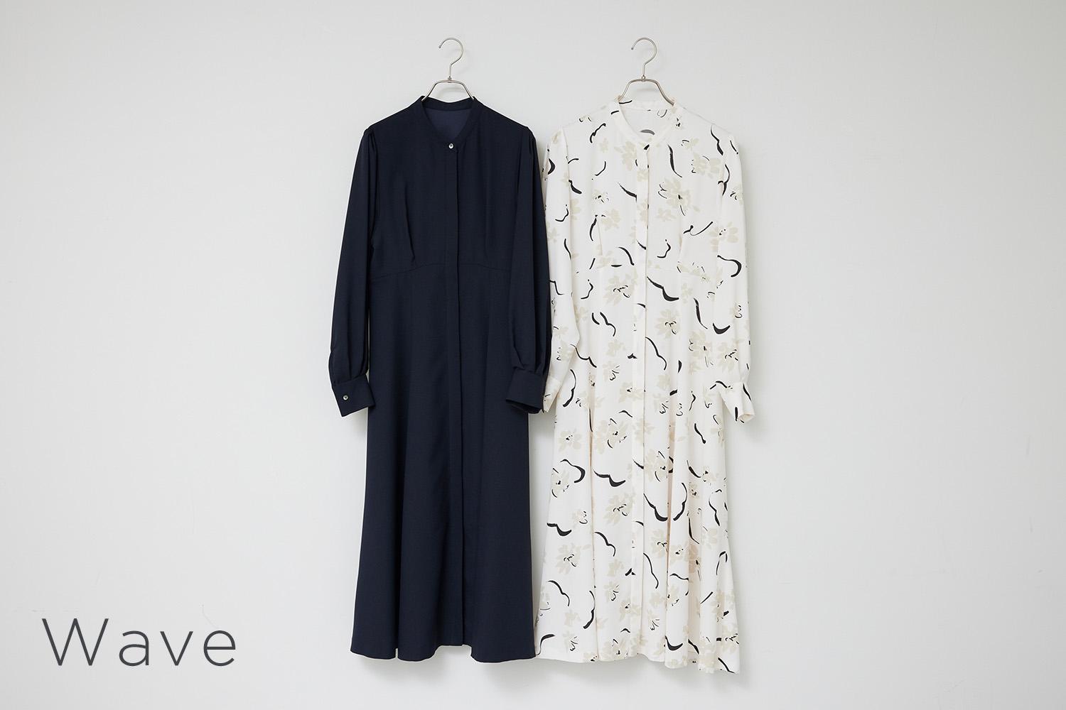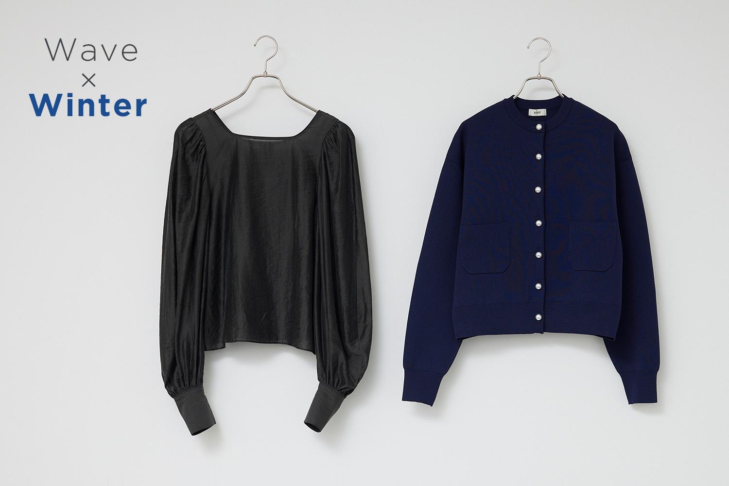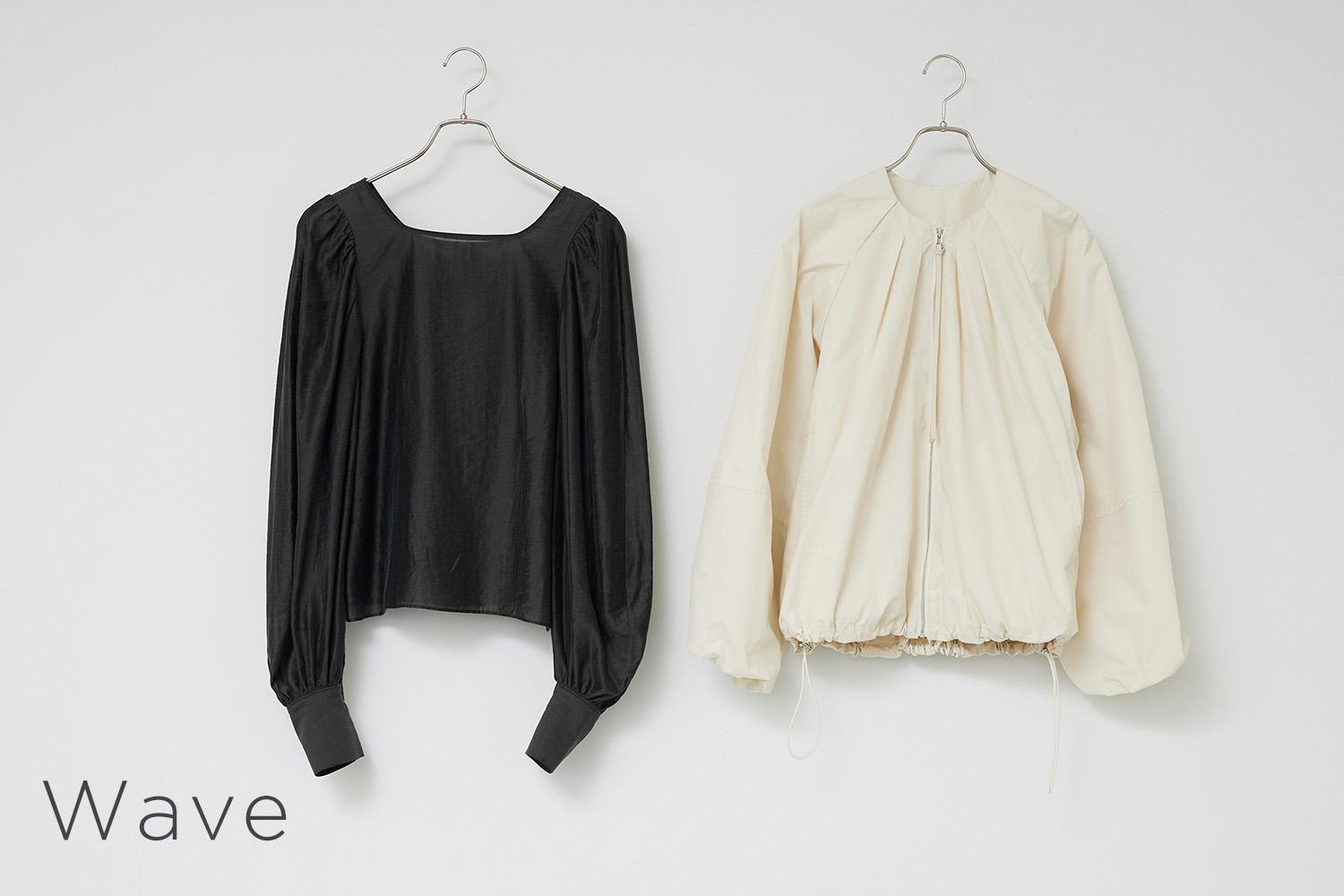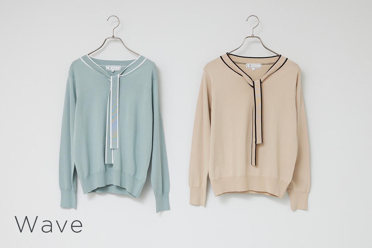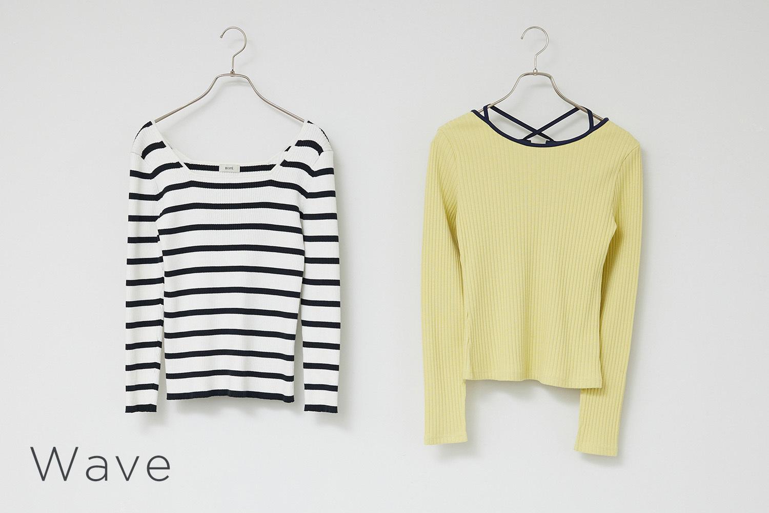 (左)身体に程よくフィットするリブ素材は、ウェーブのしなやかなラインを美しく見せます。首元がきれいに見えるスクエアネックもウェーブが得意とするデザインです。アクセサリーやヘアスタイルでボリュームをプラスすると、さらにバランスがアップします。