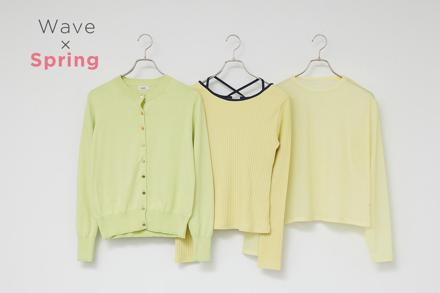 (中)スプリングが似合うイエローは、明度が高くクリアーな色。ほどよく肌にフィットするリブカットソーこそ、パーソナルカラーにあったアイテムを。ウェーブのもつしなやかな身体のラインをより美しく見せることができます。