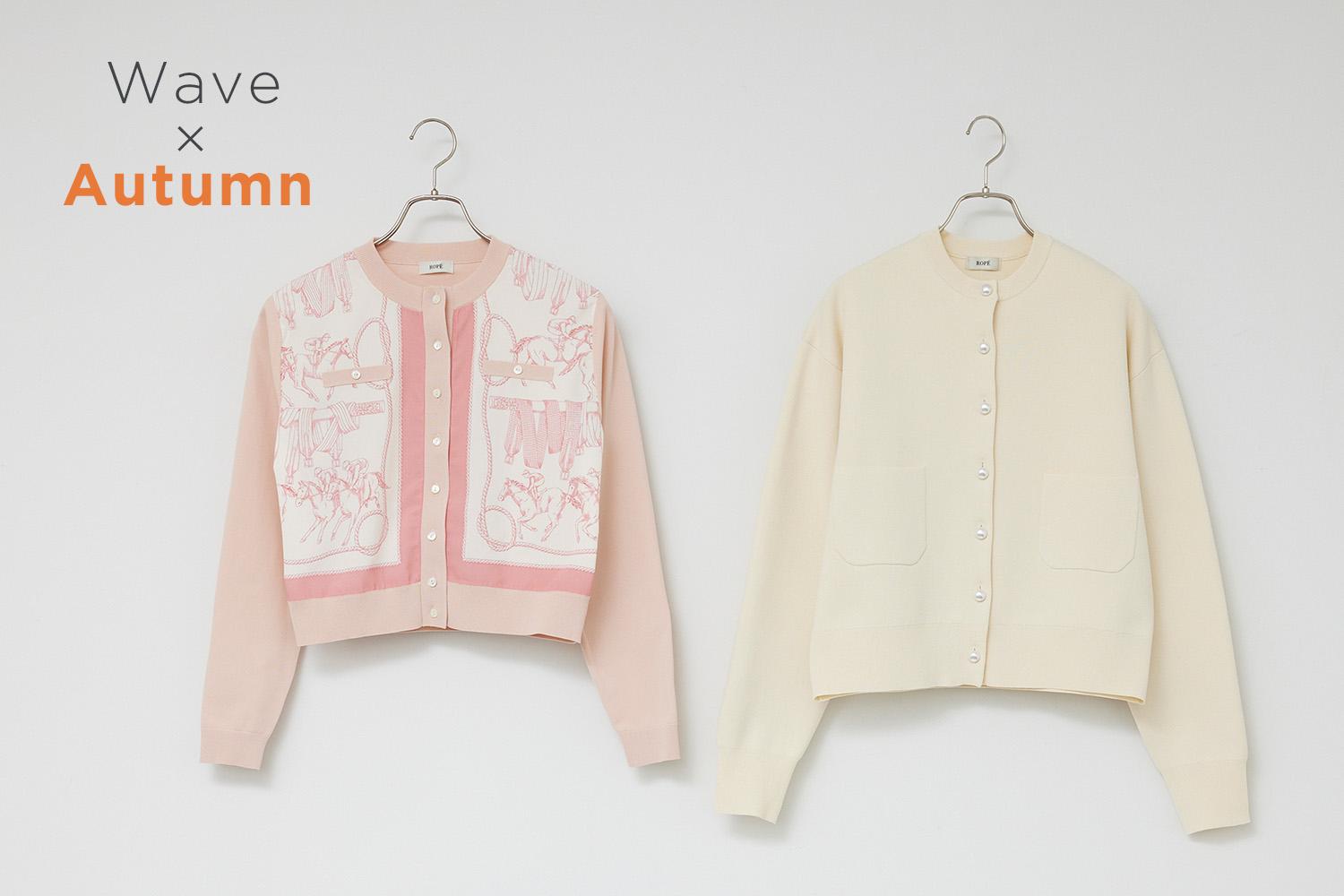 (左)やわらかな素材感とコンパクトなサイズが、ウェーブにぴったりのカーデ。くすんだ、あたたかみのあるピンクは、オータムの肌になじみ、やさしい印象に仕上がります。柄が入っているときは、カラーの分量が多いカーデ本体の色をベースに選ぶのがコツ。